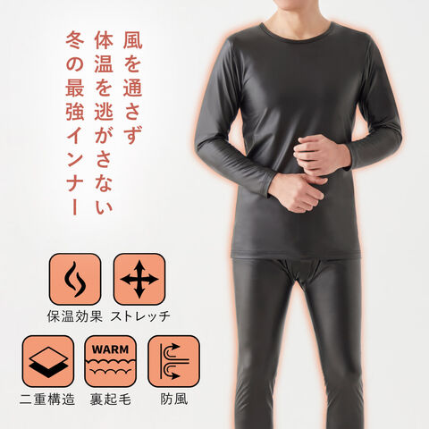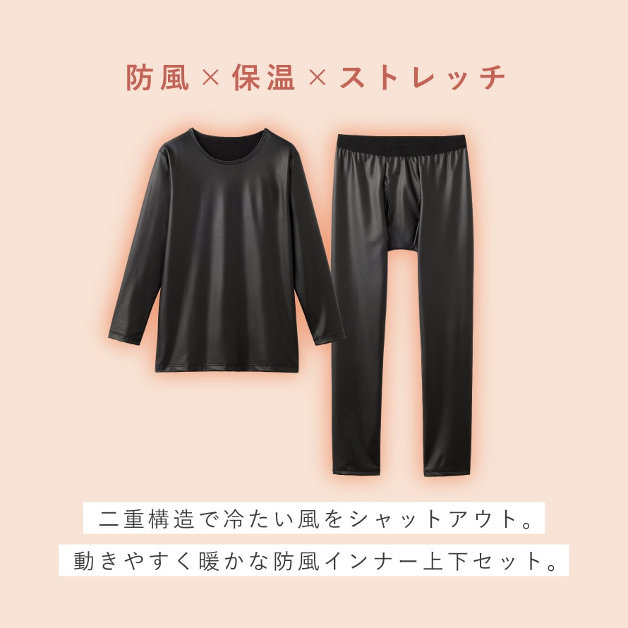 薄手のストレッチ素材で動きやすく、風を通さないだけでなく、内側までしっかり暖かい。洋服の下に着るメンズ防寒インナー上下セットです。
