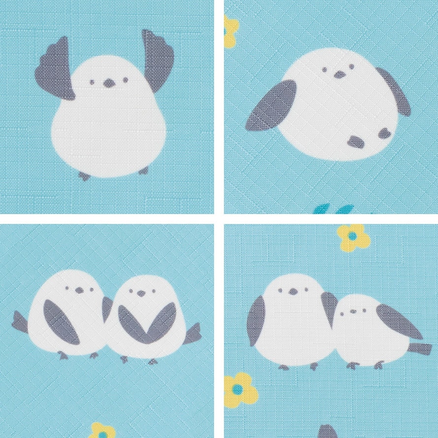 ふわふわ真っ白のまんまるい体、つぶらな瞳が愛らしいシマエナガ柄。キッチンを可愛く彩り食事時間が楽しくなるテーブルクロスです。