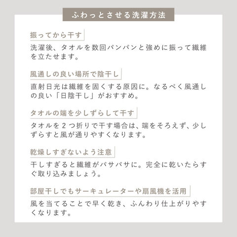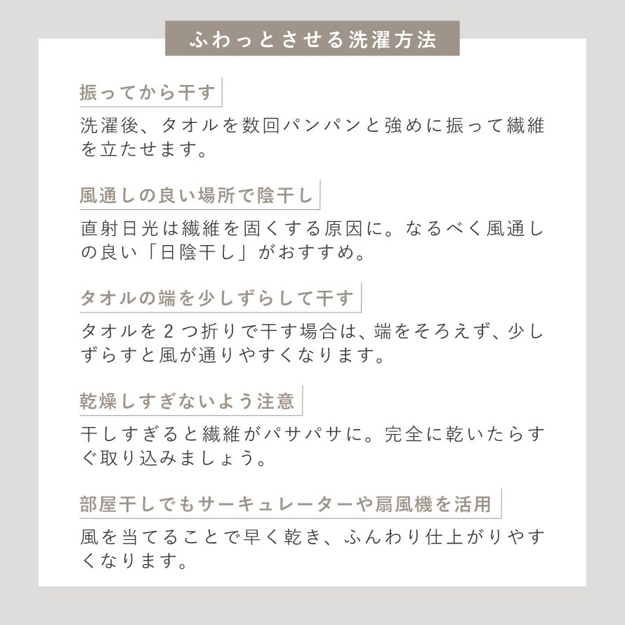 洗濯後タオルを強めに振って繊維を立たせて干すとふんわり仕上がります。直射日光は繊維を固くする原因に。なるべく風通しの良い「日陰干し」がおすすめです。