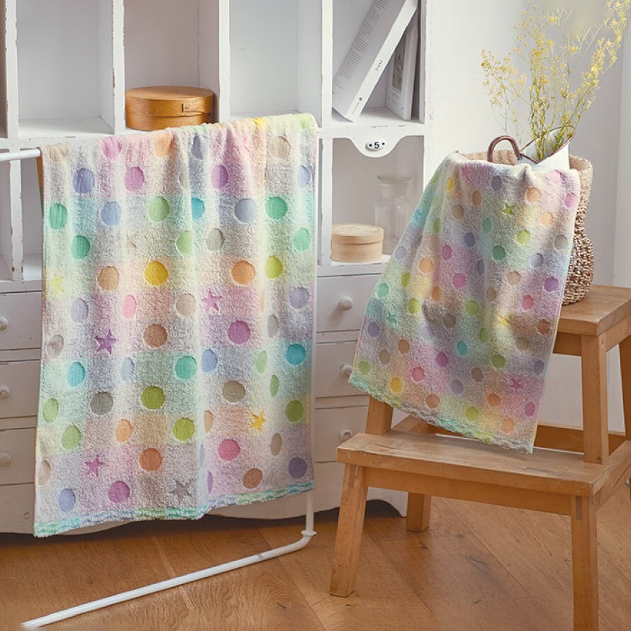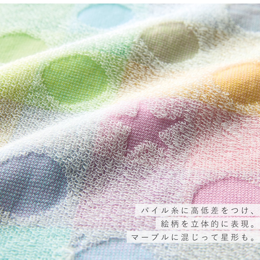 パイル糸に高低差をつけ、絵柄を立体的に表現。マーブルに混じって星形があるところも可愛いらしいポイント。