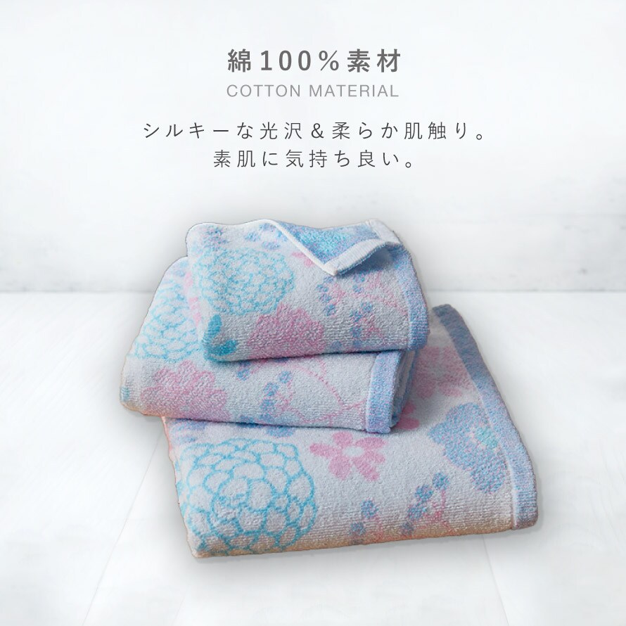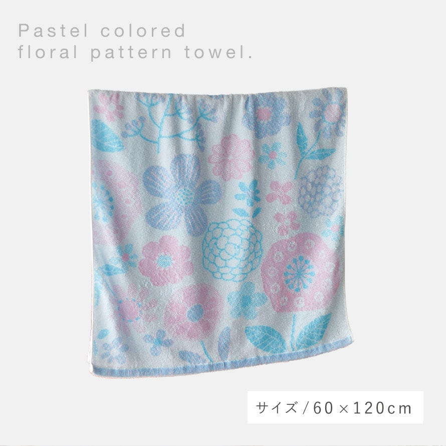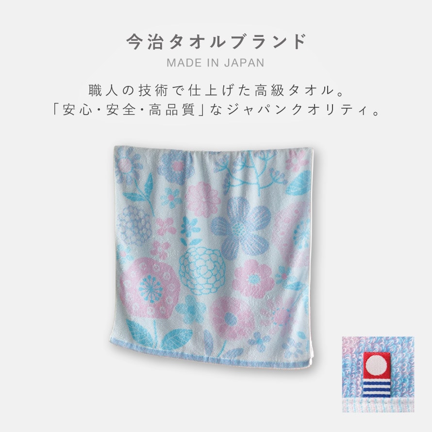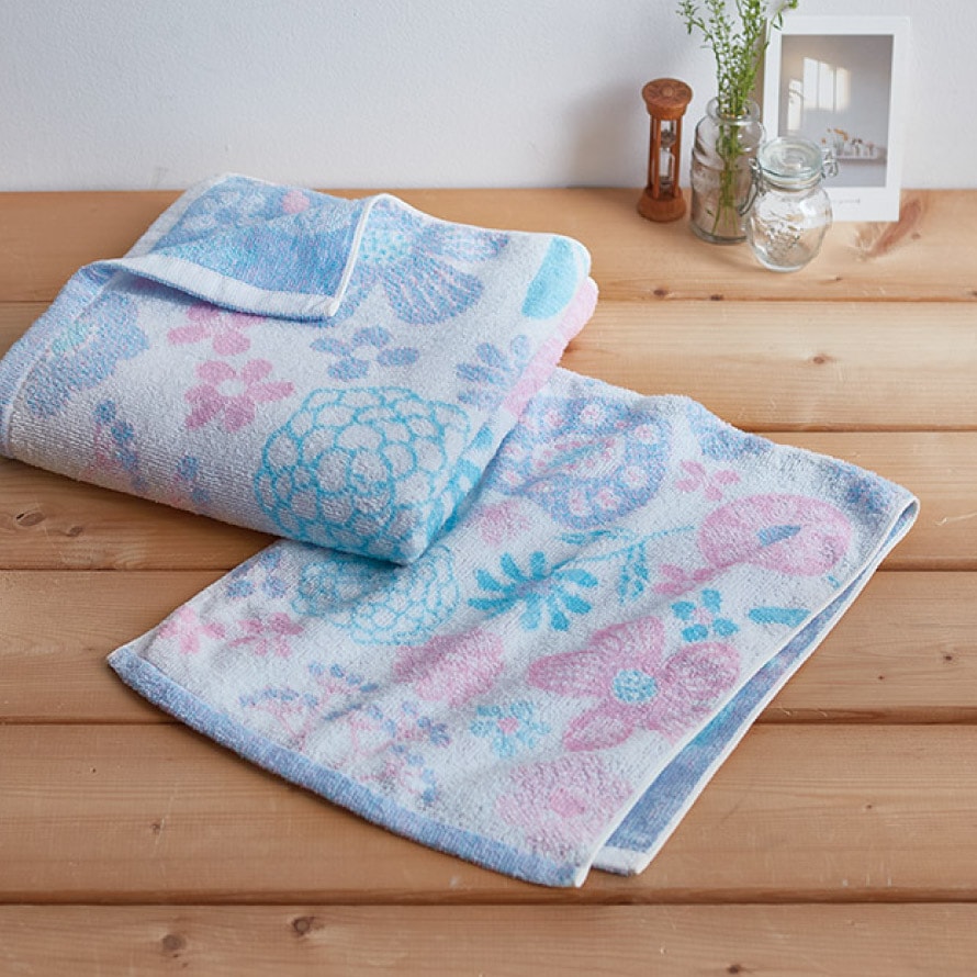 今治ブランドの高級品質、ソフトな触り心地。淡いパステルカラーの糸を3色組み合わせて花柄を表現。清涼感のあるデザインのタオルです。