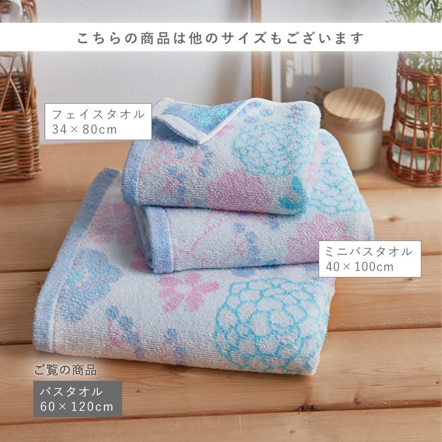 こちらのタオルは別サイズ(フェイスタオル、ミニバスタオル)もございます。シリーズで揃えて統一感のあるインテリアに。