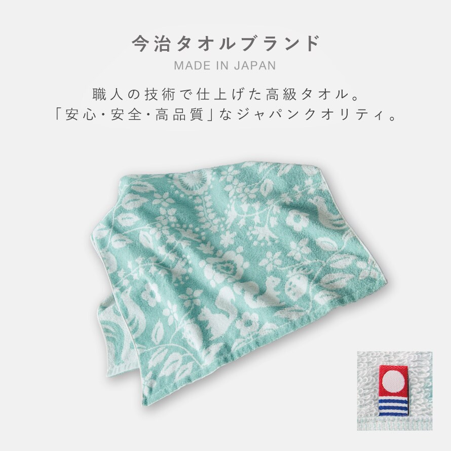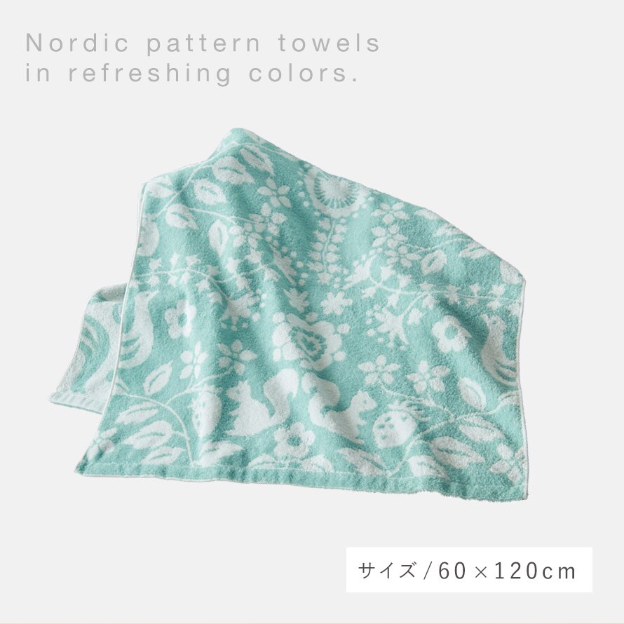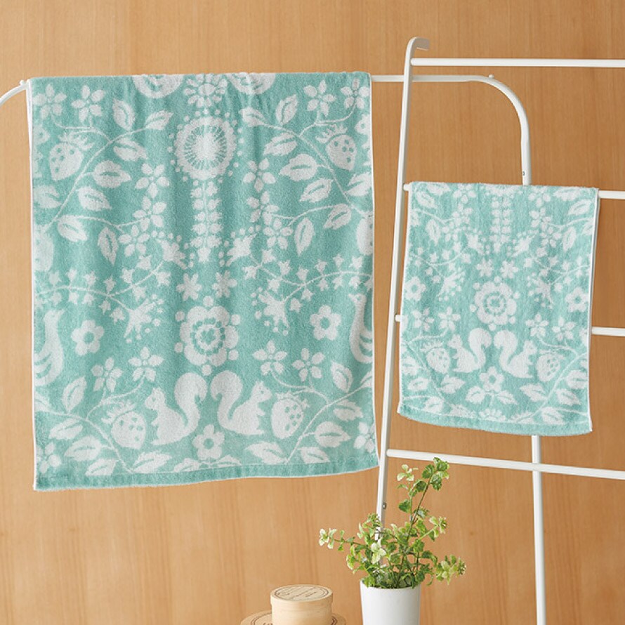 リスや鳥、草花や野いちごの絵柄を配置し、北欧の森をイメージしたデザイン。ブルーグリーンの爽やかなカラーのタオルです。