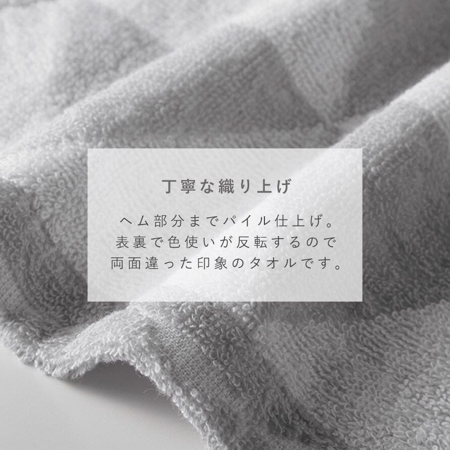 ヘム(短い辺)までパイルにすることで、吸水性と肌あたりのよいタオルに仕上げました。経験豊富なタオル職人が織機で一枚ずつ丁寧に折り上げました。表裏で織り色の出方が反転するので、反対の面はまた違った印象のタオルです。