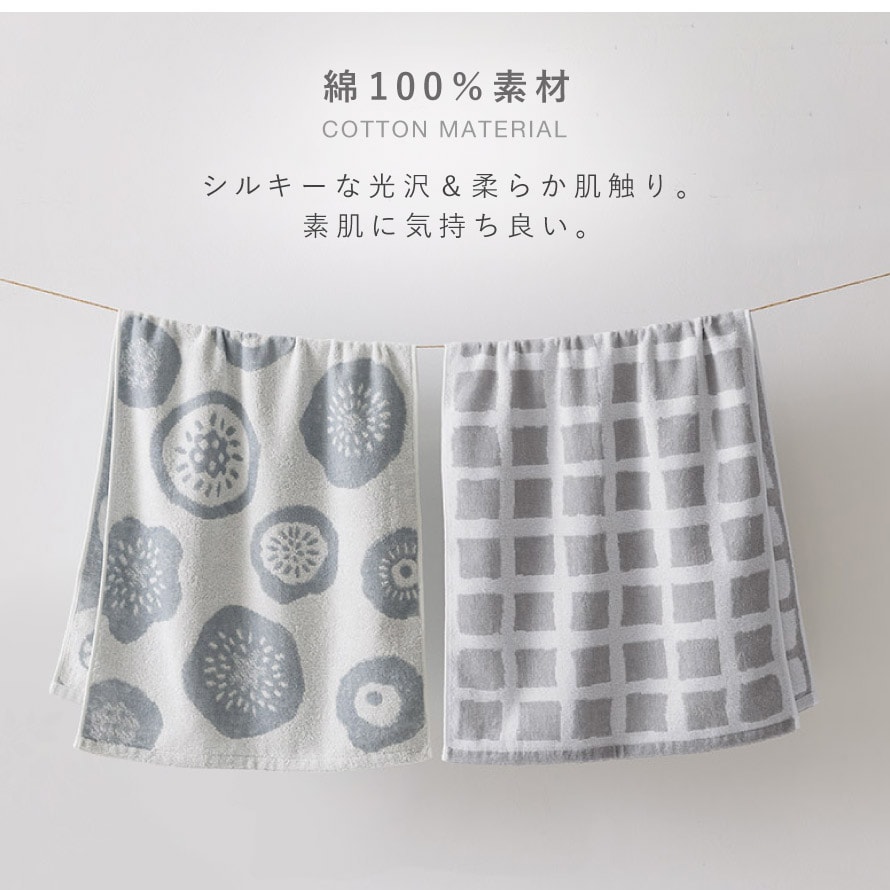 赤みがかったグレーの手書き風ブロックと、青みがかったグレーの抽象的なフラワー柄。それぞれグレーの色合いをさりげなく変えることで、同じモノトーンでも異なる表情を楽しめる仕上がりに。モノトーンカラーなので空間になじみやすく、インテリアをセンスアップ。表裏で柄の出方が反転するので、反対の面はまた違った印象のタオルです。