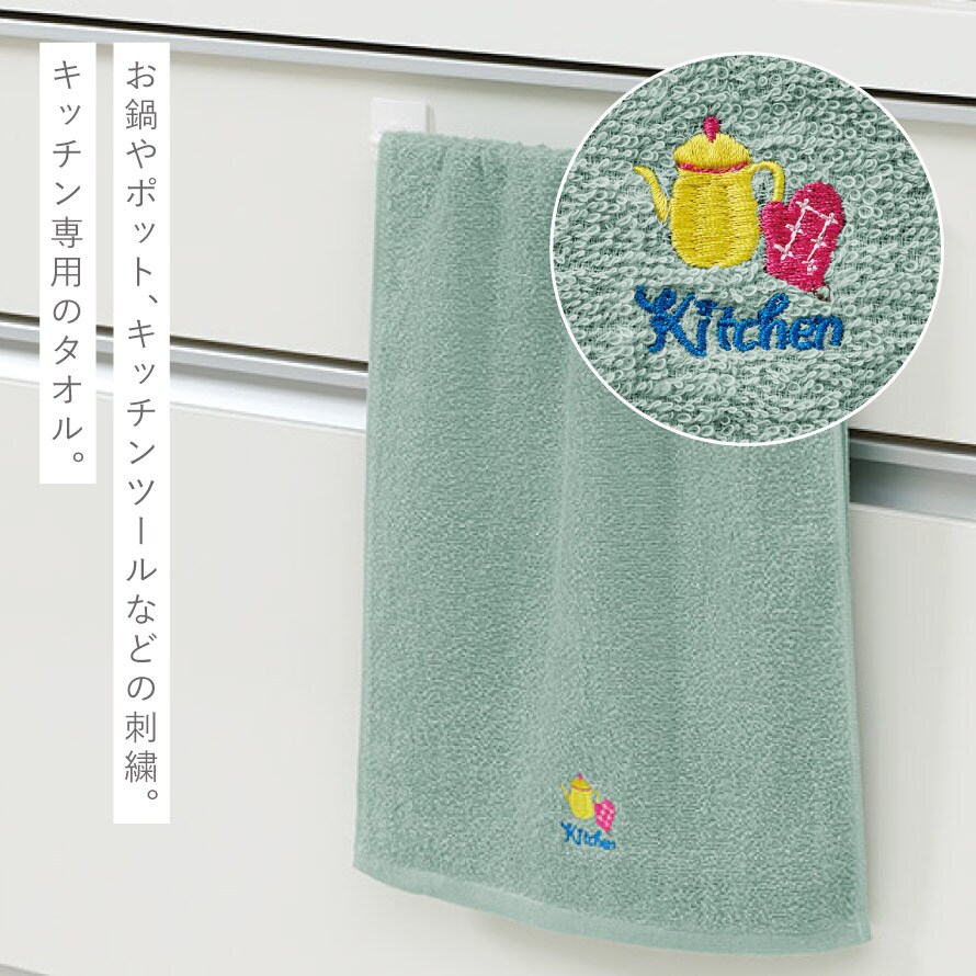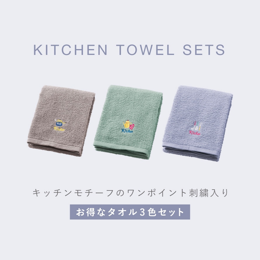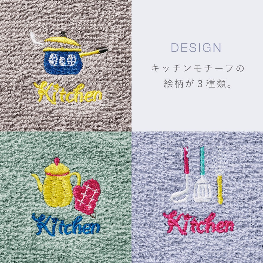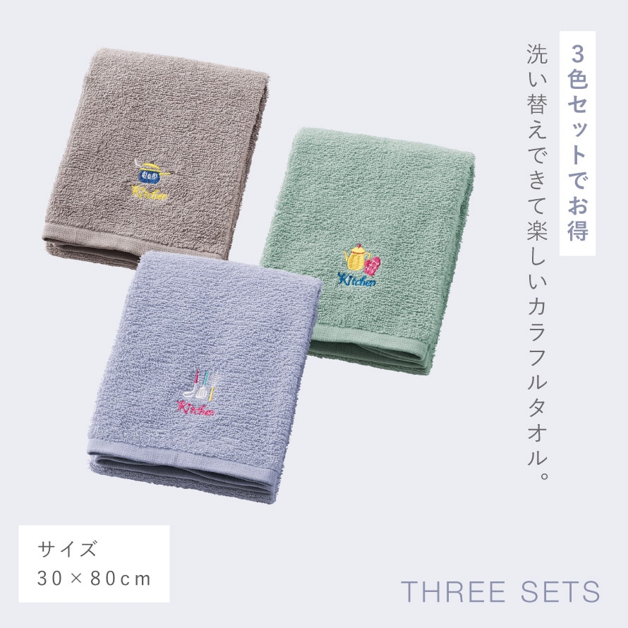 キッチンモチーフで専用タオルとわかる刺繍入り。お得な3色組。