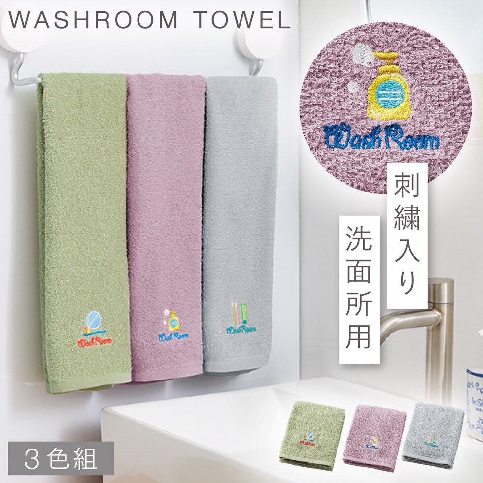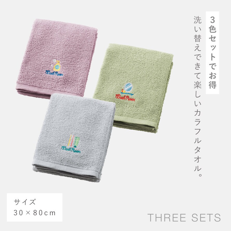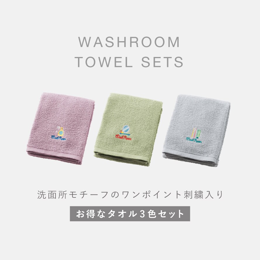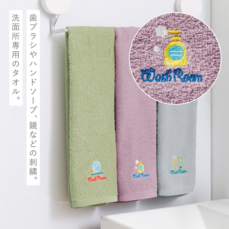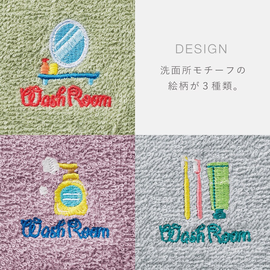 洗面所のモチーフで専用タオルとわかる刺繍入り。お得な3色組。