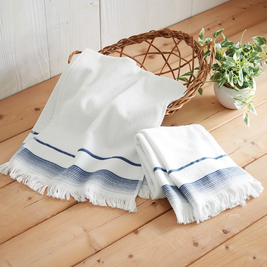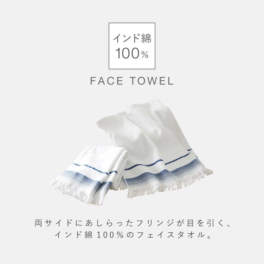 両サイドにあしらったフリンジが目を引く、インド綿100%のフェイスタオル。