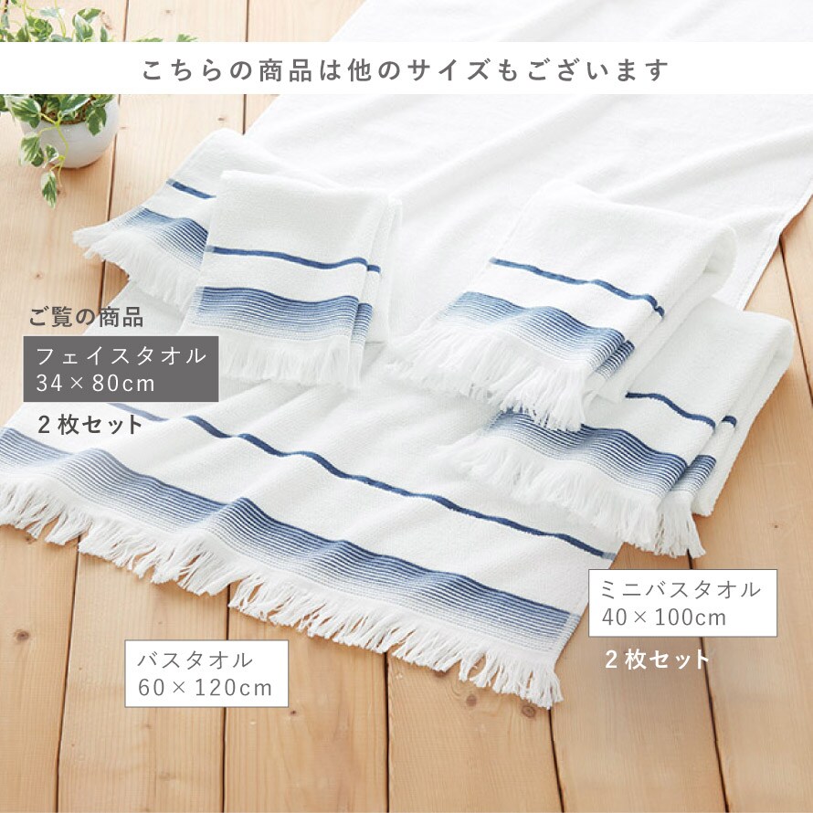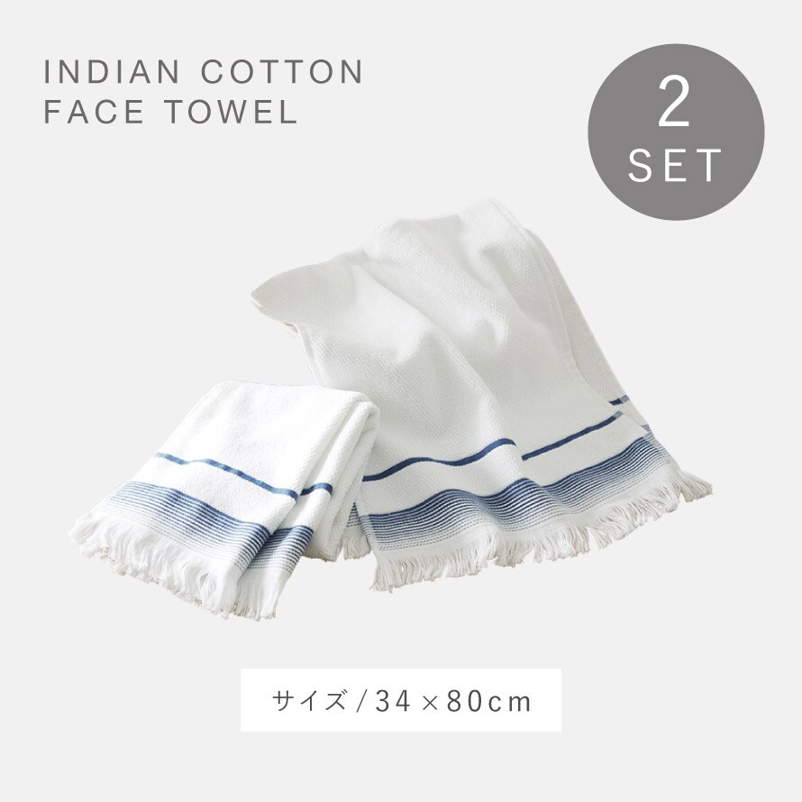 フェイスタオルタオル 34×80cm タオル 綿100% インド綿 厚手 おしゃれ インド綿フリンジがお洒落なフェイスタオル2枚組