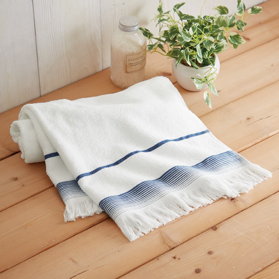 両サイドにあしらったフリンジが目を引く、インド綿100%のバスタオル。