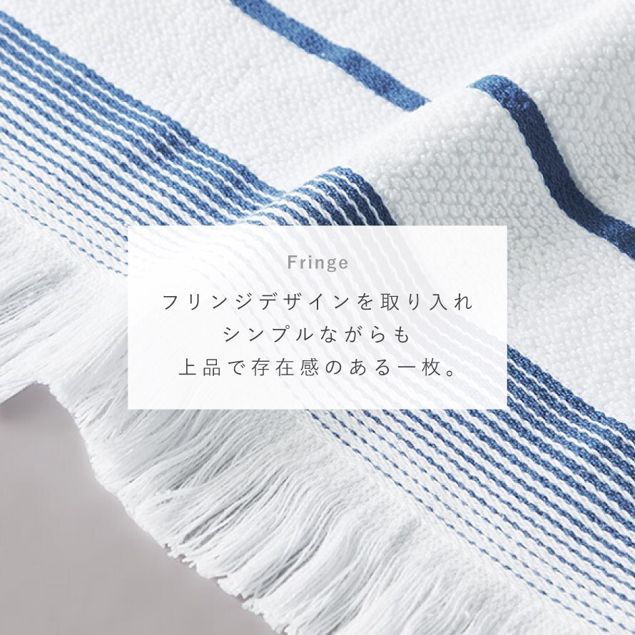 フリンジデザインを取り入れ、シンプルながらも上品で存在感のある一枚。フリンジは約3~4cm。ホワイトの地にネイビーの横ボーダーがアクセントとなり、洗練された印象です。