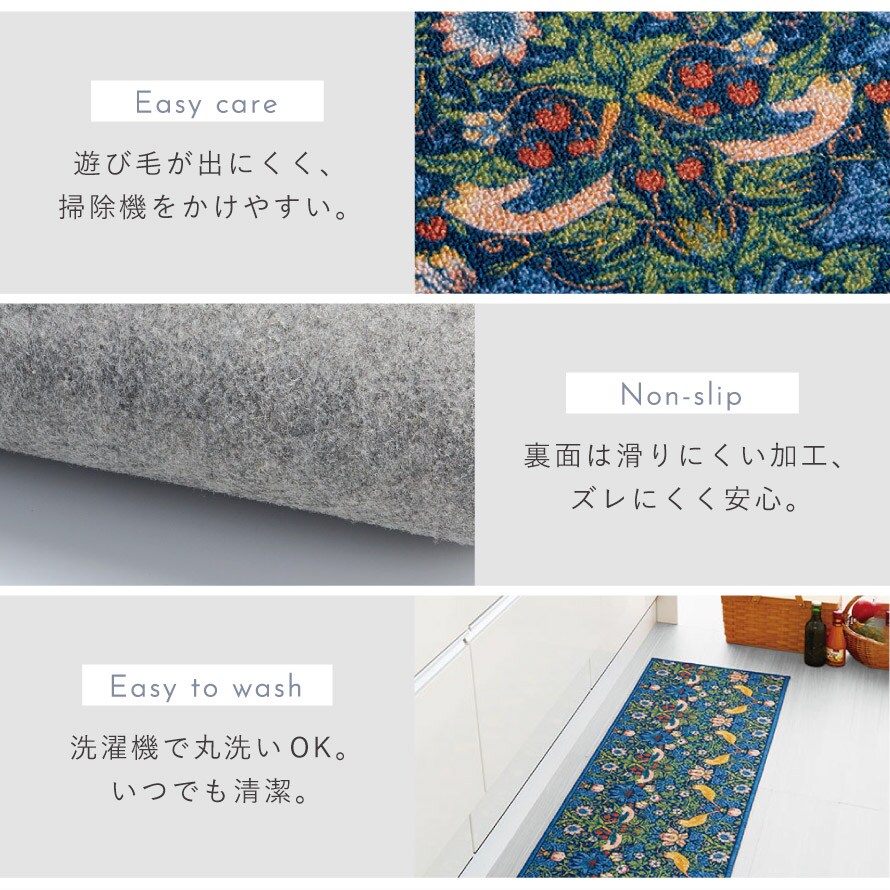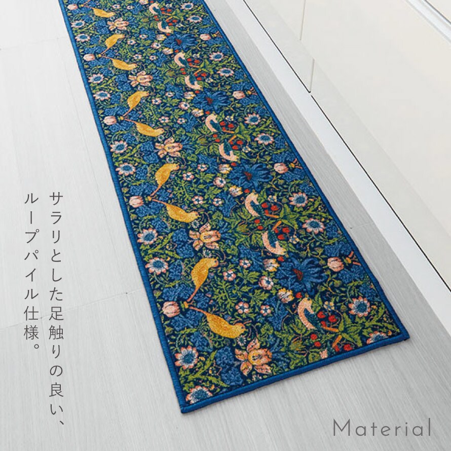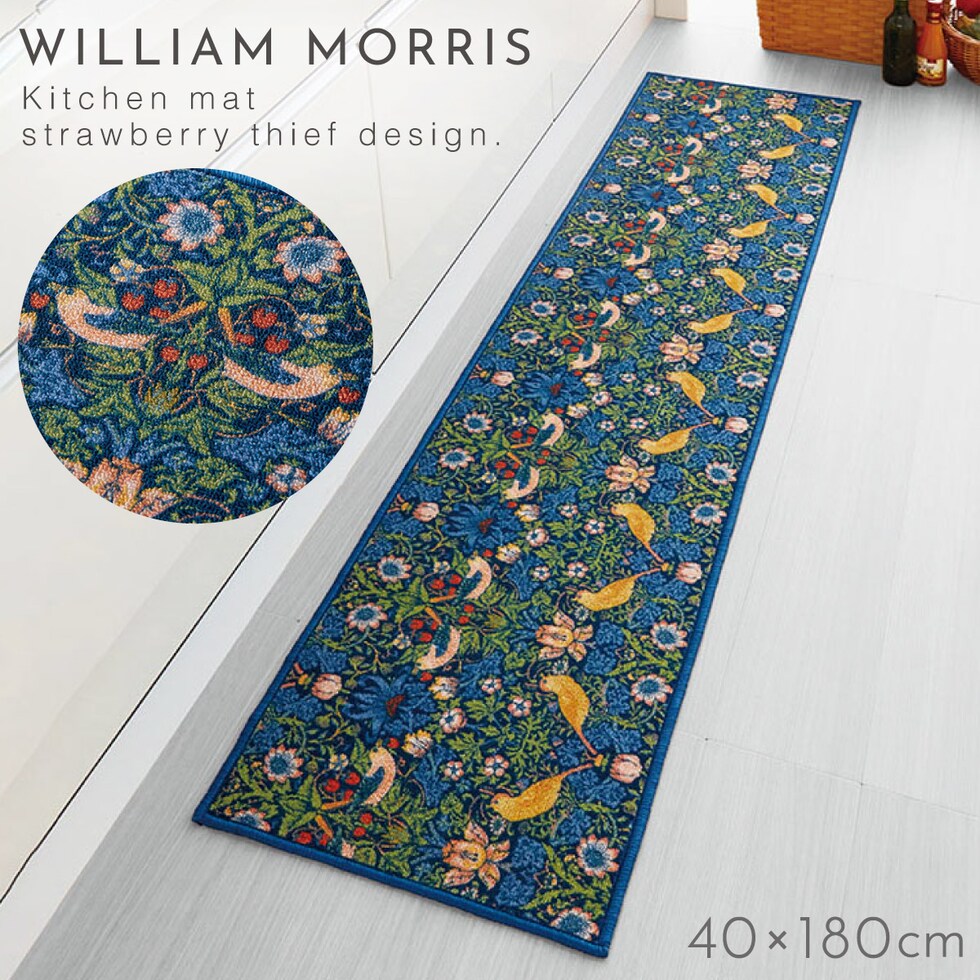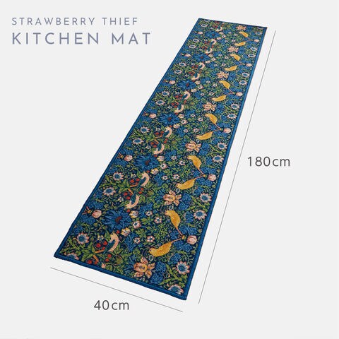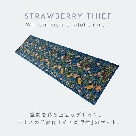 ウィリアム・モリスの代表作「いちご泥棒」のキッチンマット。植物、鳥やイチゴの繊細で美しい絵柄が、インテリアに彩りを加えます。