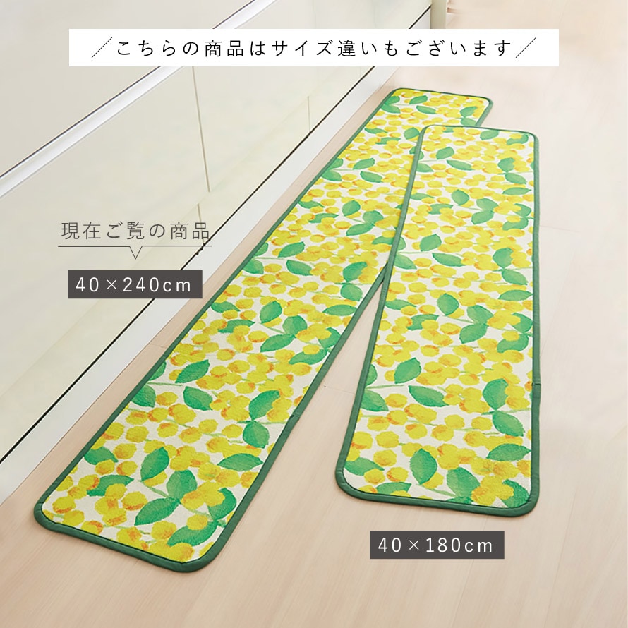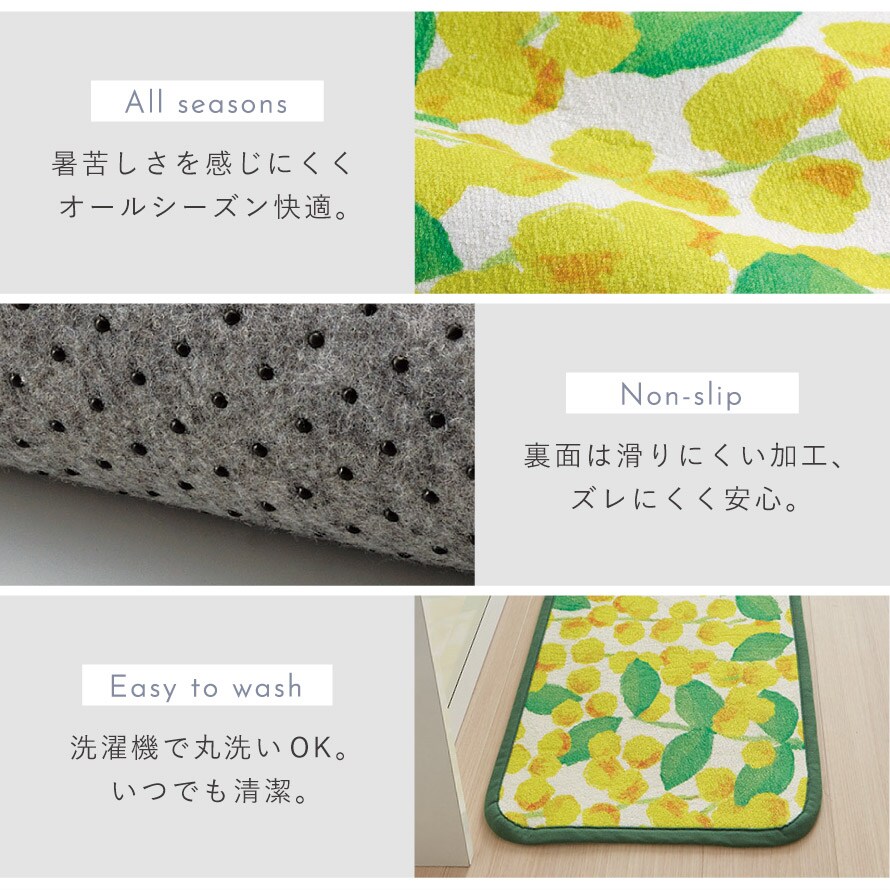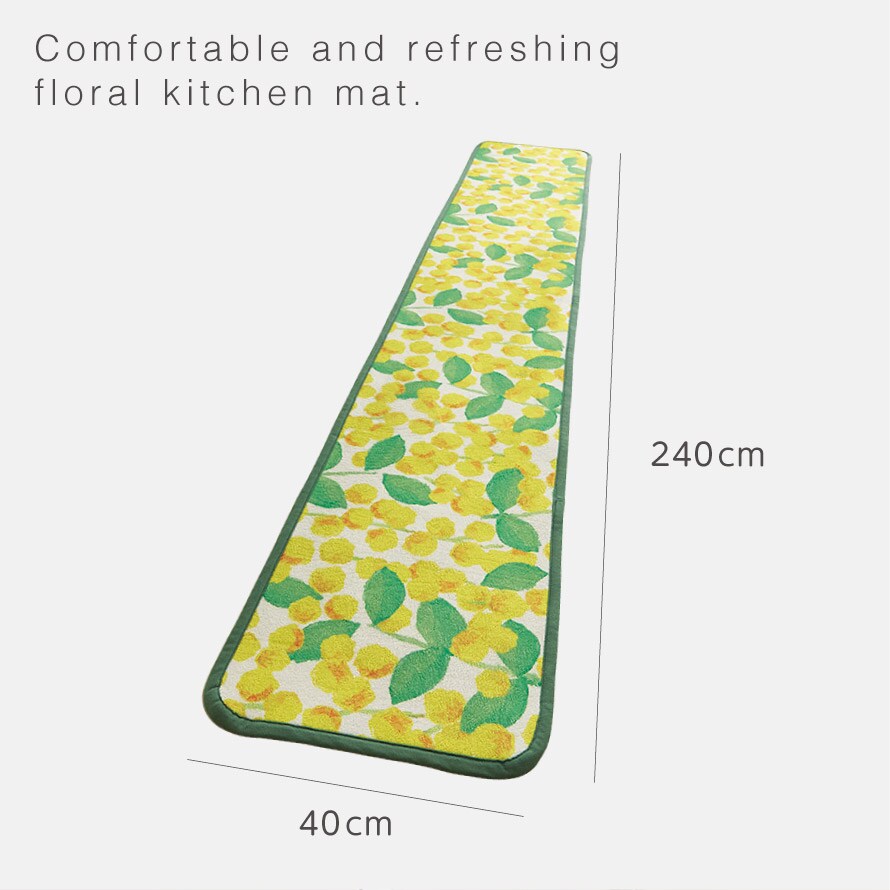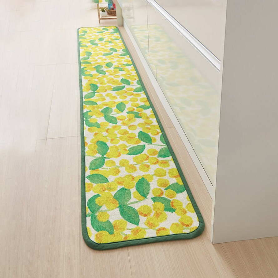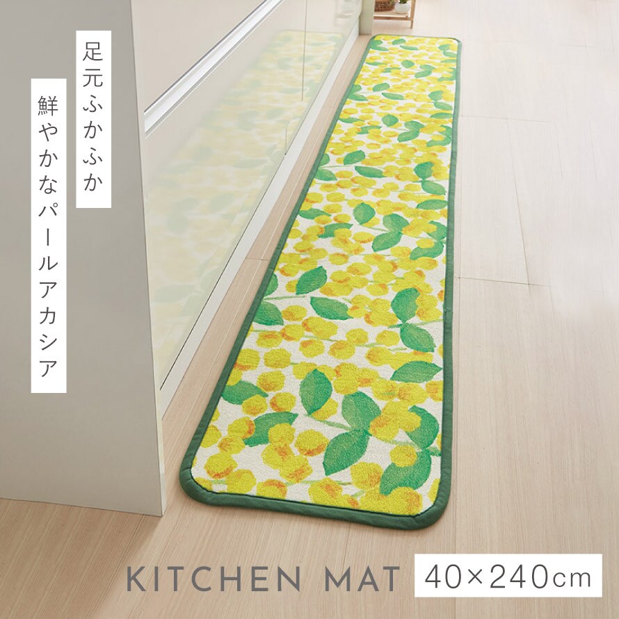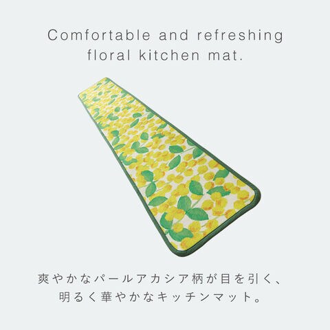 爽やかなパールアカシア柄が目を引く、明るく華やかなキッチンマット。毎日の家事時間を楽しく彩ります。