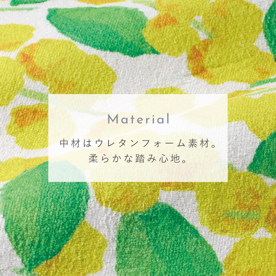 中材にはウレタンフォームを使用。足裏をやさしく包み込む柔らかな踏み心地。立ち仕事の多いキッチンタイムも快適に。表地は肌ざわりの良い素材で、素足でも気持ちよくお使いいただけます。暑苦しさを感じにくい素材感です。