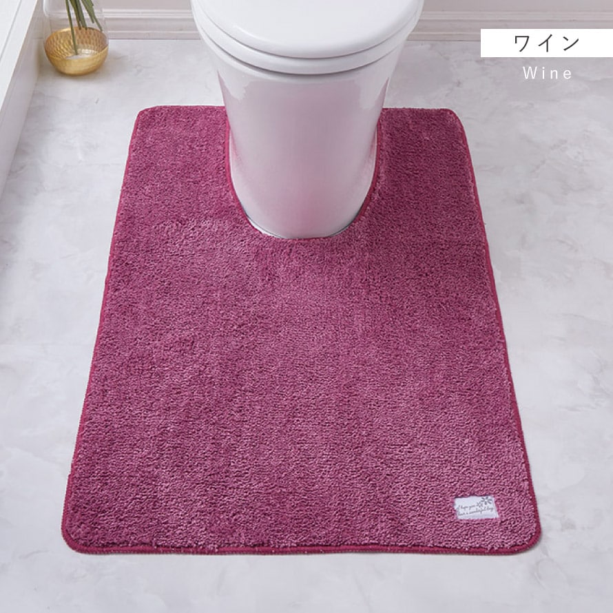 どんなトイレのインテリアにも合わせやすい無地のトイレマット。右端のタグがワンポイント。