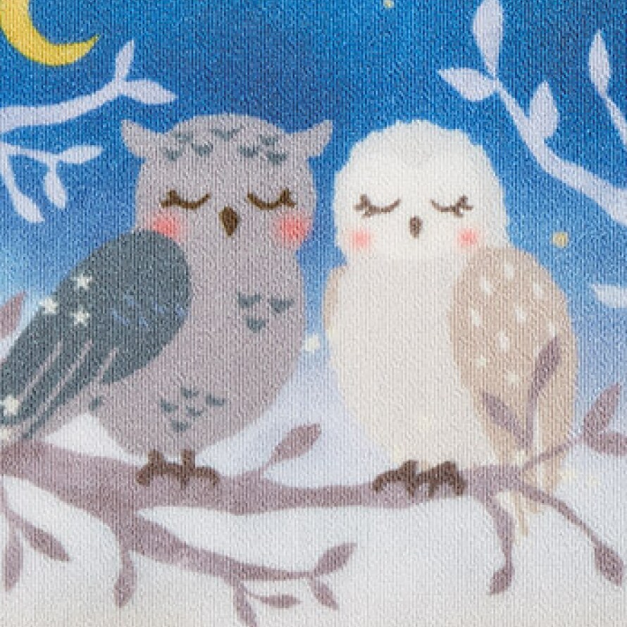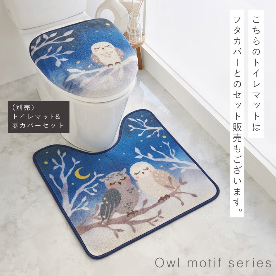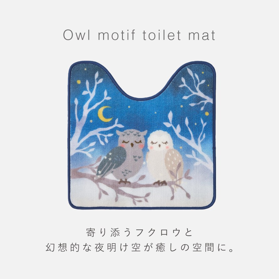愛らしく縁起の良いフクロウモチーフ。夜明けの空をイメージした深いブルーのグラデーションは、幻想的で落ち着いた雰囲気。日常のトイレ空間を、癒しのひとときに。