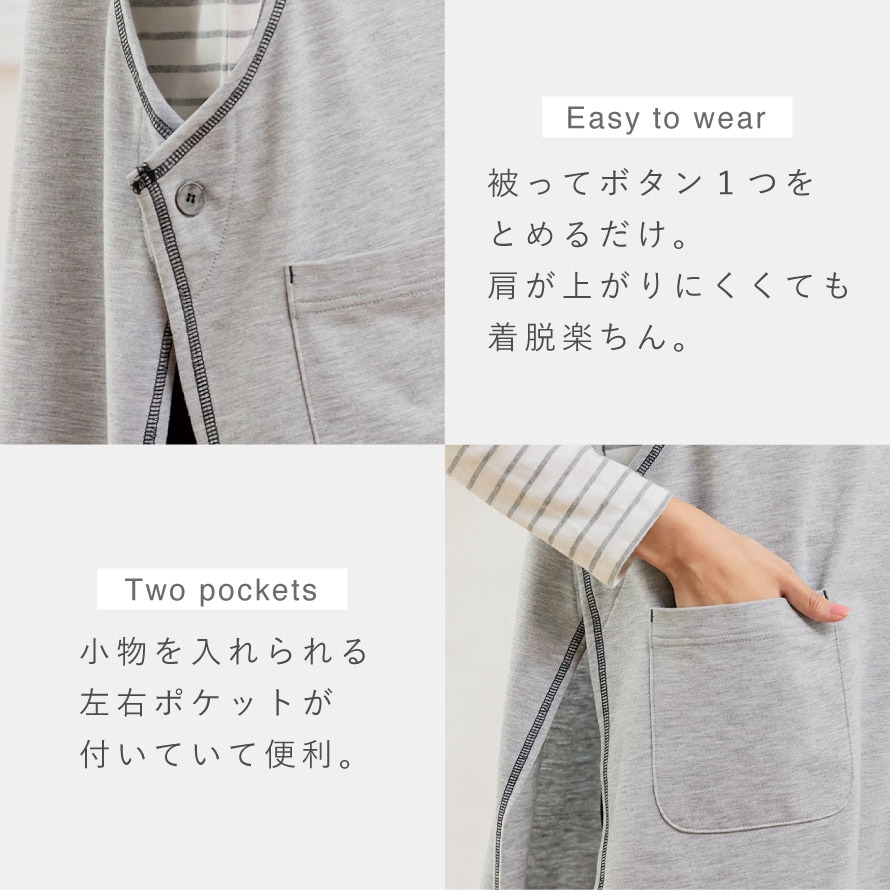 気になる体のラインを拾わないベスト型。頭からかぶって両サイドのボタンをとめるだけ。ゆったり設計なので着脱楽ちん。