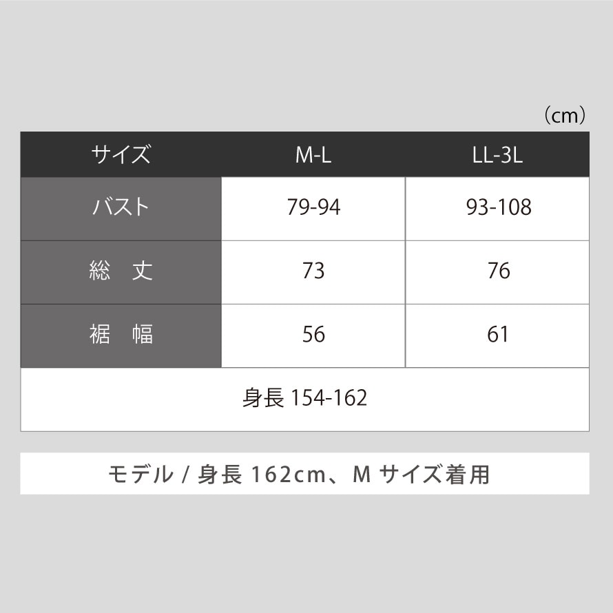 | サイズ | 身長154-162、M-L/バスト79-94、総丈73、裾幅56、LL-3L/バスト93-108、総丈76、裾幅61cm |