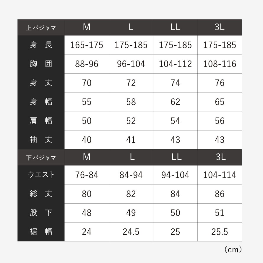 サイズM/身長165-175、胸囲88-96、身丈70、身幅55、肩幅50、袖丈40、ウエスト76-84、総丈80、股下48、裾幅24、L/身長175-185、胸囲96-104、身丈72、身幅58、肩幅52、袖丈41、ウエスト84-94、総丈82、股下49、裾幅24.5、LL/身長175-185、胸囲104-112、身丈74、身幅62、肩幅54、袖丈43、ウエスト94-104、総丈84、股下50、裾幅25、3L/身長175-185、胸囲108-116、身丈76、身幅65、肩幅56、袖丈43、ウエスト104-114、総丈86、股下51、裾幅25.5cm