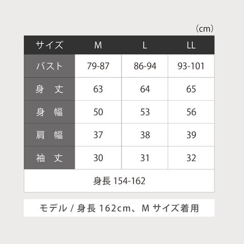 | サイズ | 身長154-162、M/バスト79-87、身丈63、身幅50、肩幅37、袖丈30、L/バスト86-94、身丈64、身幅53、肩幅38、袖丈31、LL/バスト93-101、身丈65、身幅56、肩幅39、袖丈32cm |