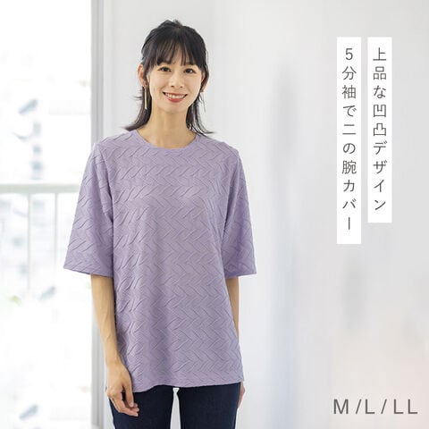プルオーバー レディース 春夏 きれいめ チュニック 大人可愛い 5分袖 ジャガード 体型カバー 5分袖ジャガード柄プルオーバー M L LL 3L 大きいサイズ 大きめ ゆったり 50代 60代 70代 ミセス ファッション
