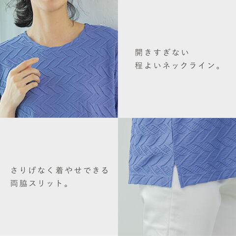 ストレッチが効いていてシワになりにくいニット素材。凹凸があるので肌にさらりとした着心地です。