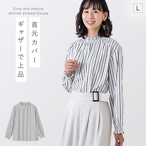 ブラウス ストライプ 長袖 レディース シャーリングブラウス 体型カバー 長め ロング きれいめ ストライプシャーリングブラウス M L LL 大きいサイズ ゆったり ミセス 30代 40代 50代 60代 おしゃれ