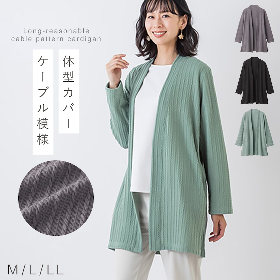 カーディガン レディース トップス ロング 体型カバー 袖 ゆったり ケーブル ロングカーディガン きれいめ ケーブル柄ロングカーディガン M L LL 大きいサイズ ゆったり ミセスファッション 40代 50代 60代 70代 おしゃれ