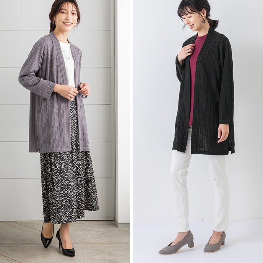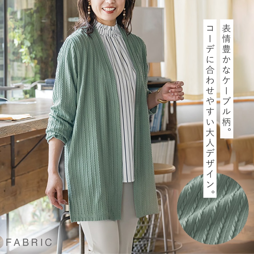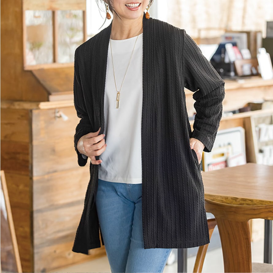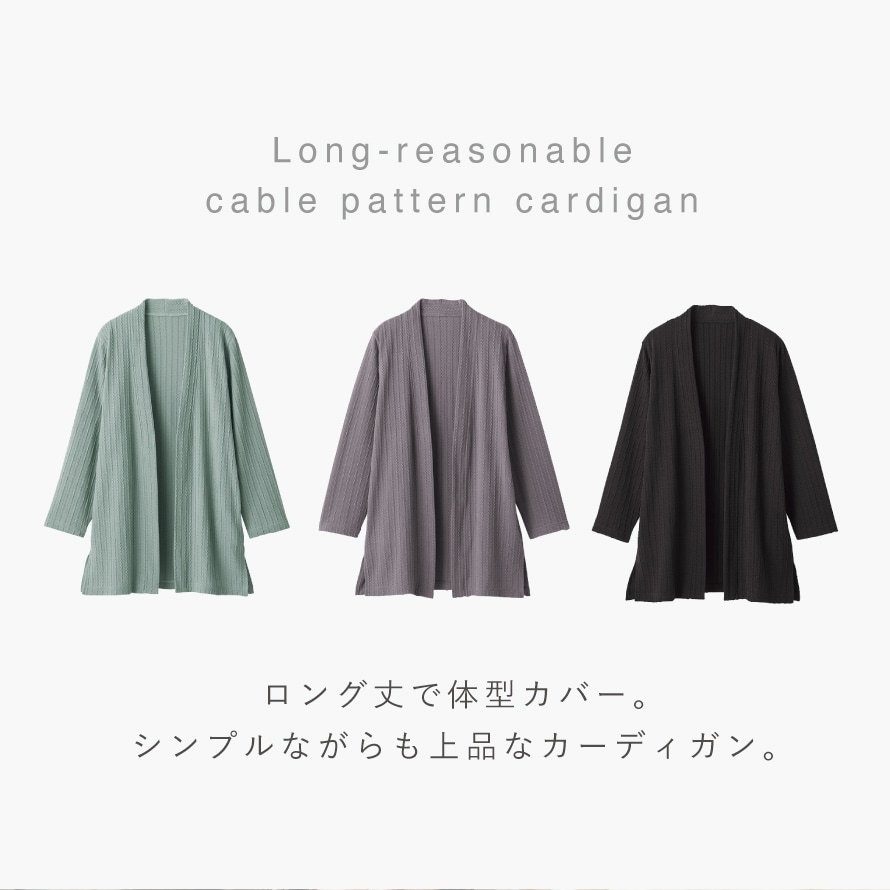 ケーブル模様がポイント。体型カバーも叶える上品カーディガン。