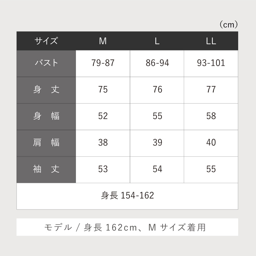 | サイズ | 身長154-162、M/バスト79-87、身丈75、身幅52、肩幅38、袖丈53、L/バスト86-94、身丈76、身幅55、肩幅39、袖丈54、LL/バスト93-101、身丈77、身幅58、肩幅40、袖丈55cm |