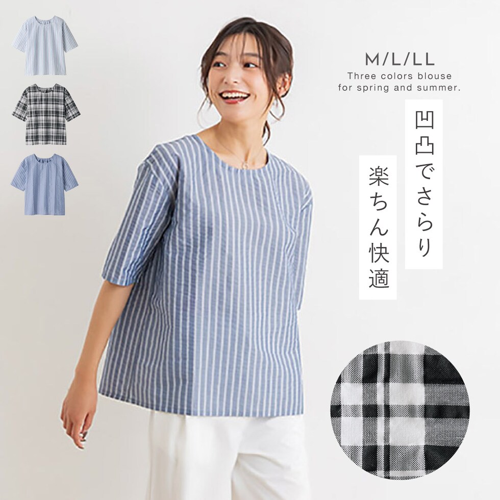 ブラウス レディース 春 五分袖 ストライプ チェック 春物 トップス サッカー生地 綿混サッカー素材ブラウス M L LL 大きいサイズ ゆったり 体型カバー 40代 50代 60代 70代
