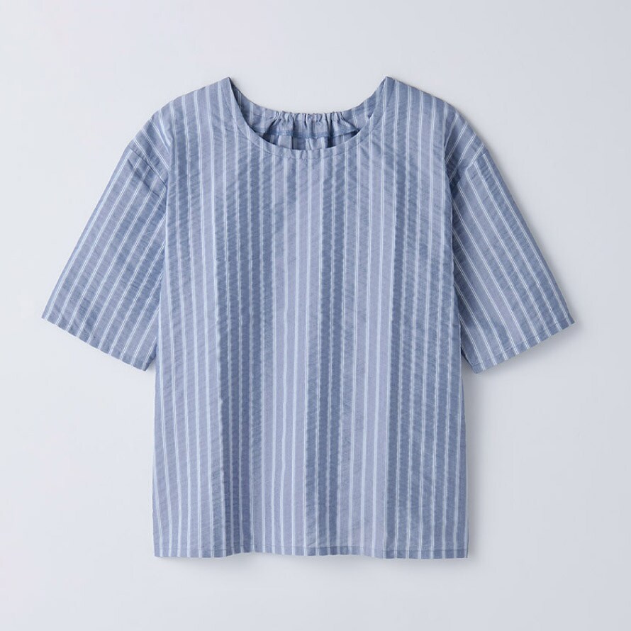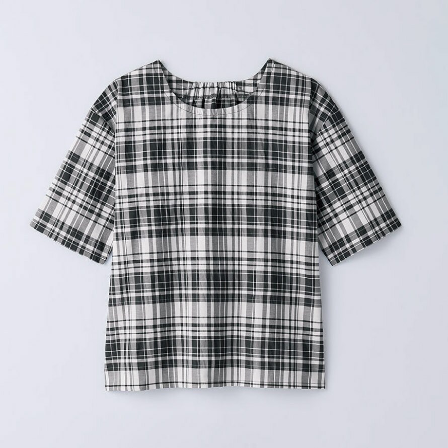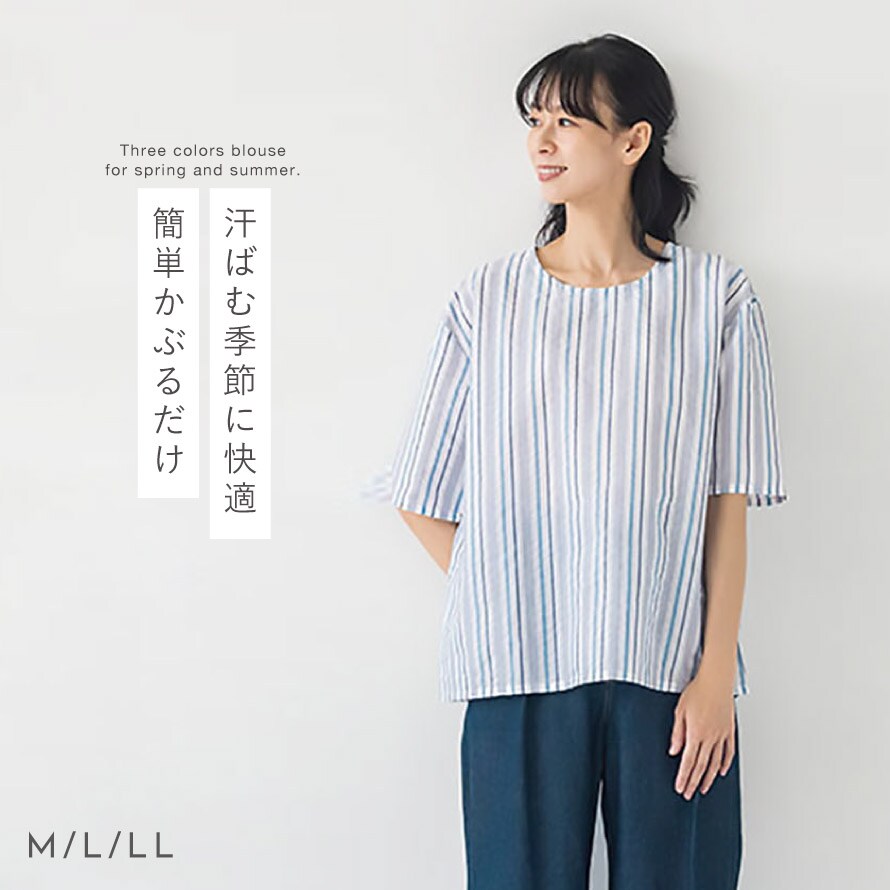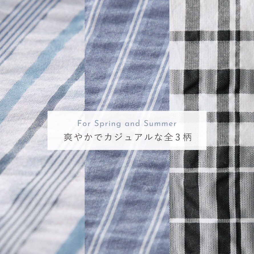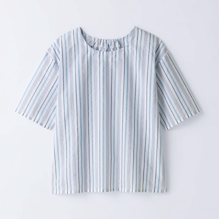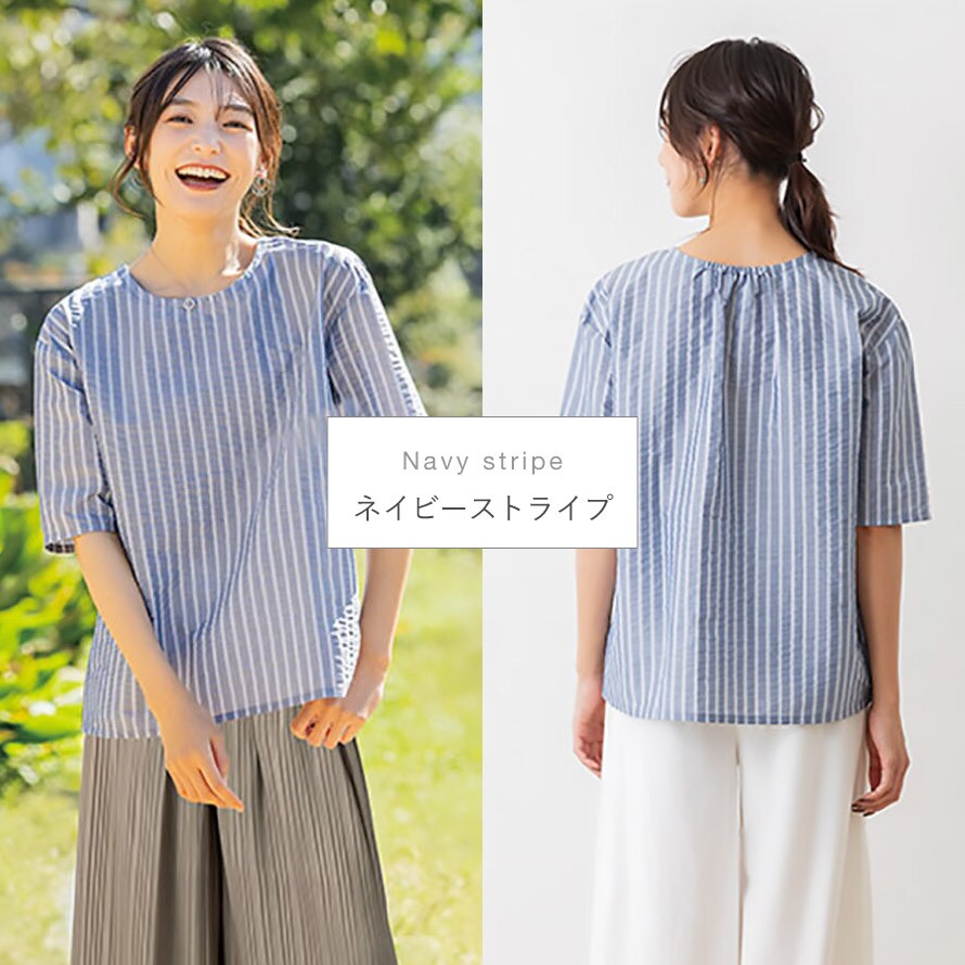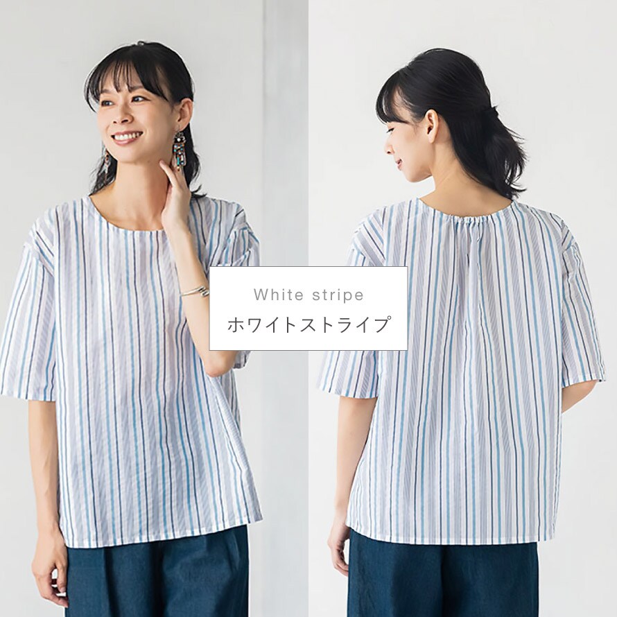 カラーは爽やかなホワイトストライプ、上品なネイビーストライプ、落ち着いた印象のブラックチェックの3色をご用意。毎日のコーディネートに取り入れやすい、軽やかで実用性の高いブラウスです。