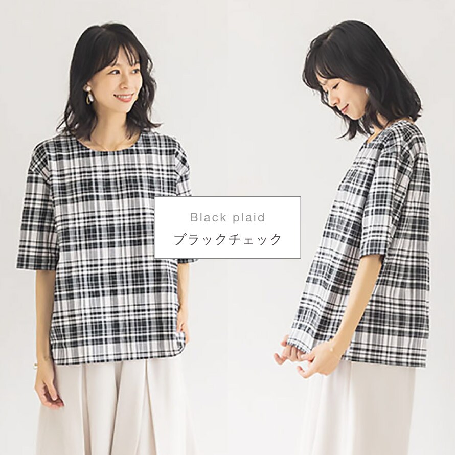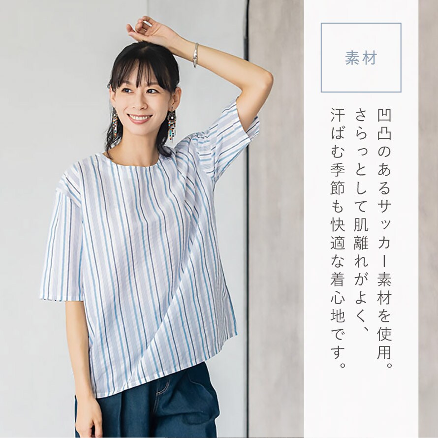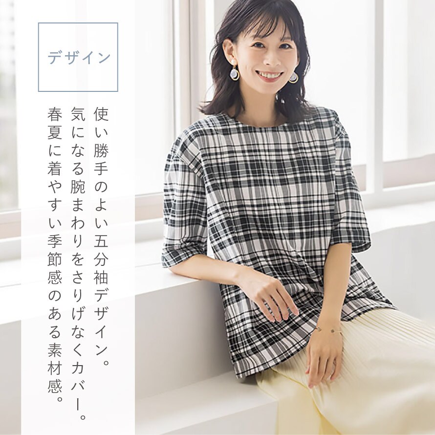 使い勝手のよい五分袖デザインは、気になる腕まわりをさりげなくカバー。初夏から盛夏にかけてはもちろん、重ね着次第で長いシーズンお楽しみいただけます。特に春夏に着やすい、季節感のある素材感です。