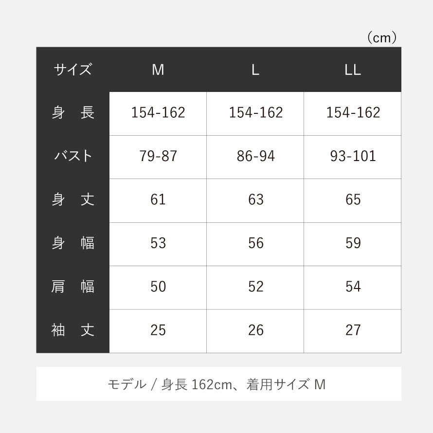 サイズ身長154-162、M/バスト79-87、身丈61、身幅53、肩幅50、袖丈25、L/バスト86-94、身丈63、身幅56、肩幅52、袖丈26、LL/バスト93-101、身丈65、身幅59、肩幅54、袖丈27cm