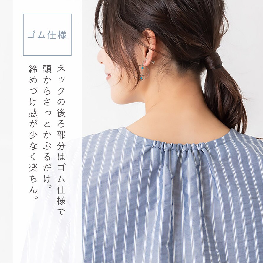 ネックの後ろ部分はゴム仕様になっており、頭からさっとかぶるだけで簡単に着脱可能。ボタンを留める手間がなく、忙しい朝にも便利です。締めつけ感が少なく、やさしい着心地も魅力。