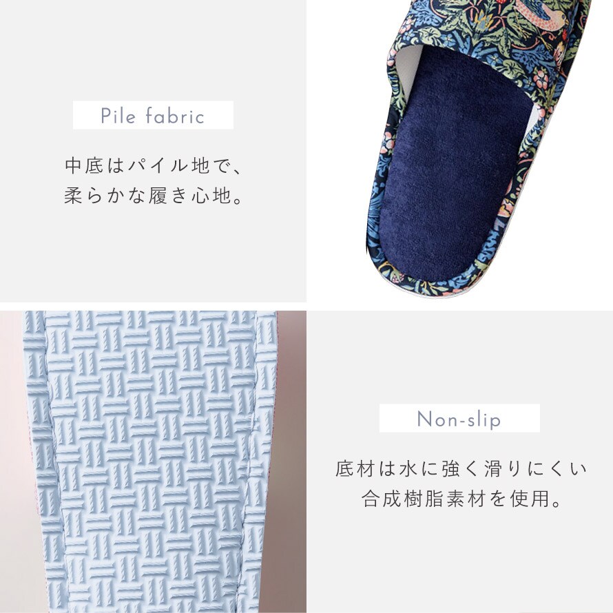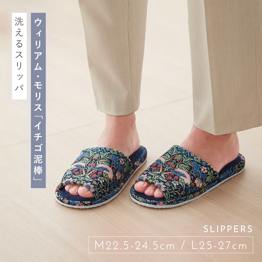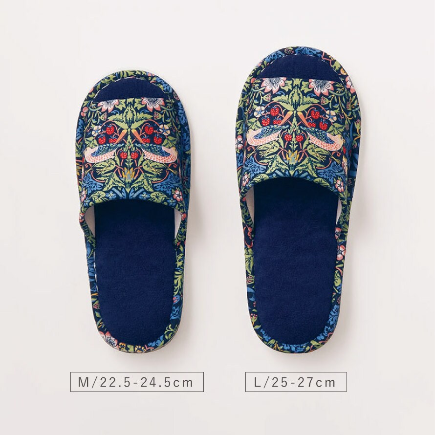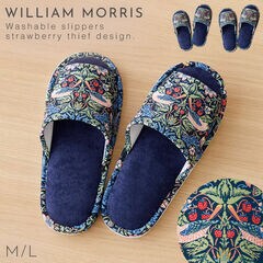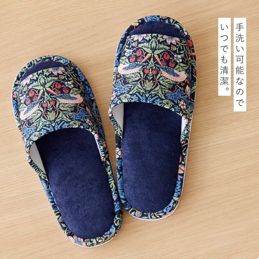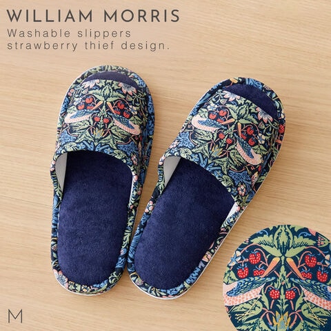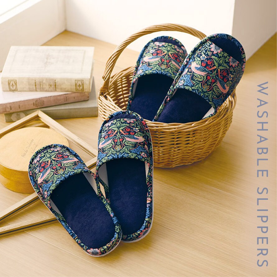 ウィリアム・モリスの代表作「いちご泥棒」の洗えるスリッパ。植物、鳥やイチゴの繊細で美しい絵柄が、インテリアに彩りを加えます。