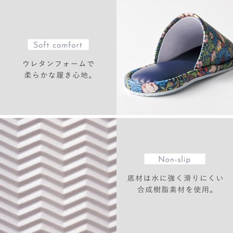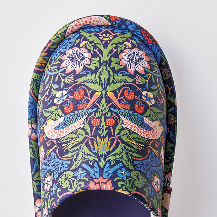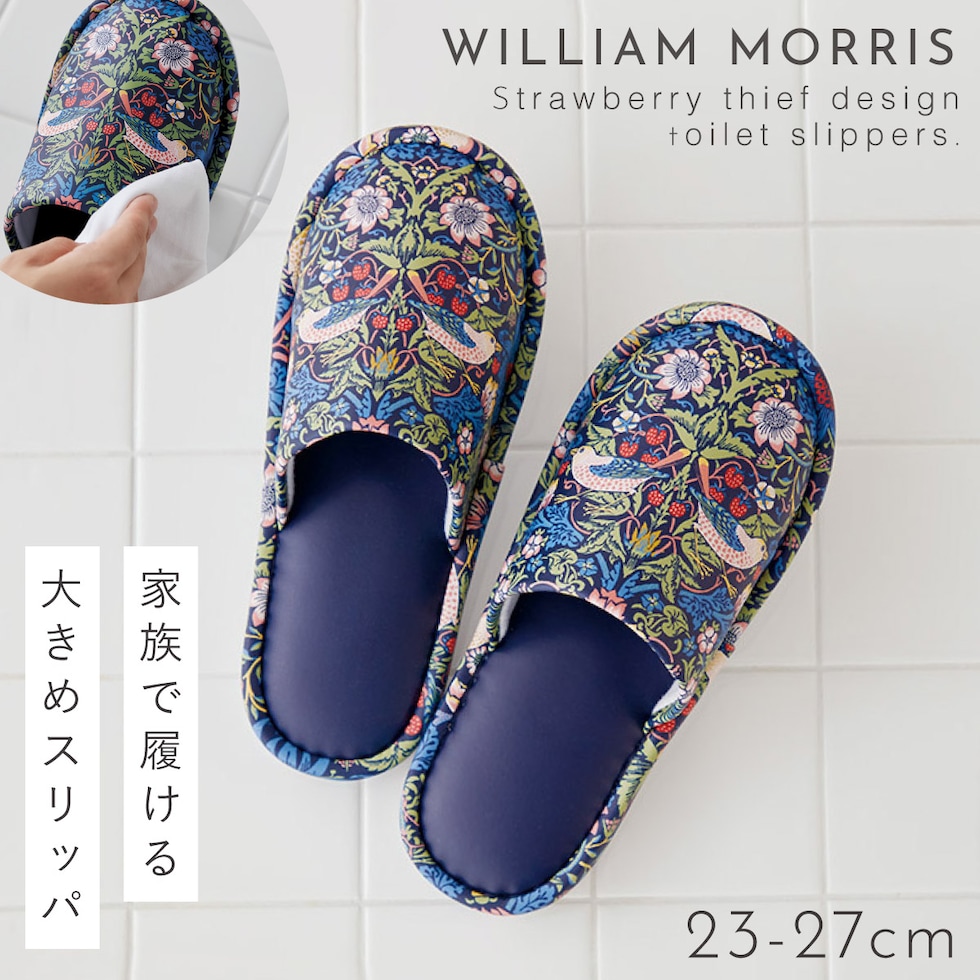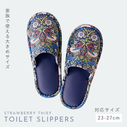 ウィリアム・モリスの代表作「いちご泥棒」のトイレスリッパ。植物、鳥やイチゴの繊細で美しい絵柄が、インテリアに彩りを加えます。