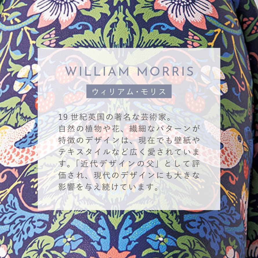 自然の植物や花、繊細なパターンが特徴のデザインは、現在でも壁紙やテキスタイルなど広く愛されています。「近代デザインの父」として評価され、現代のデザインにも大きな影響を与え続けています。