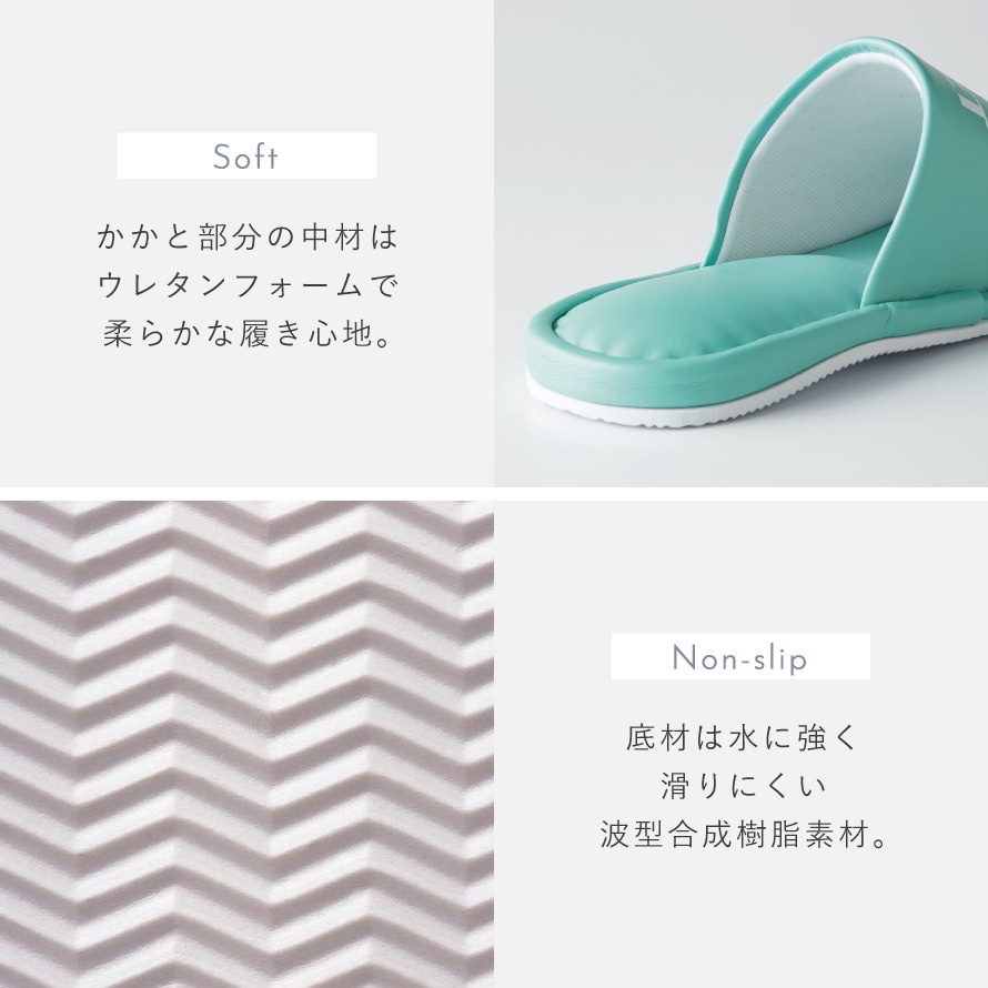 底材は水に強く、すべりにくい波型合成樹脂素材。かかと部分の中材はウレタンフォームで柔らかな履き心地です。
