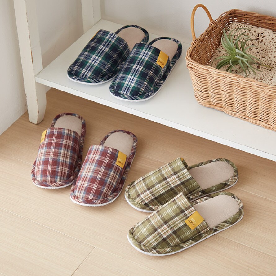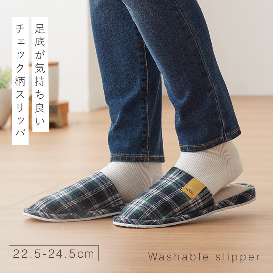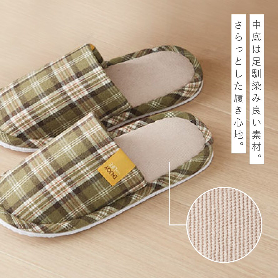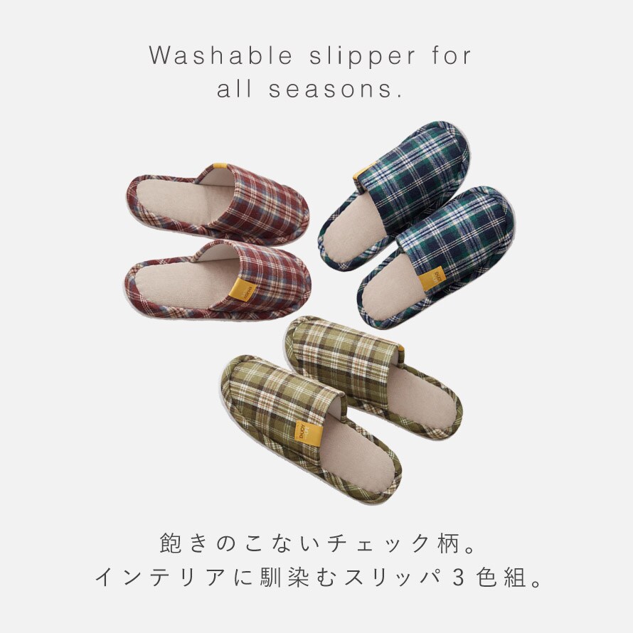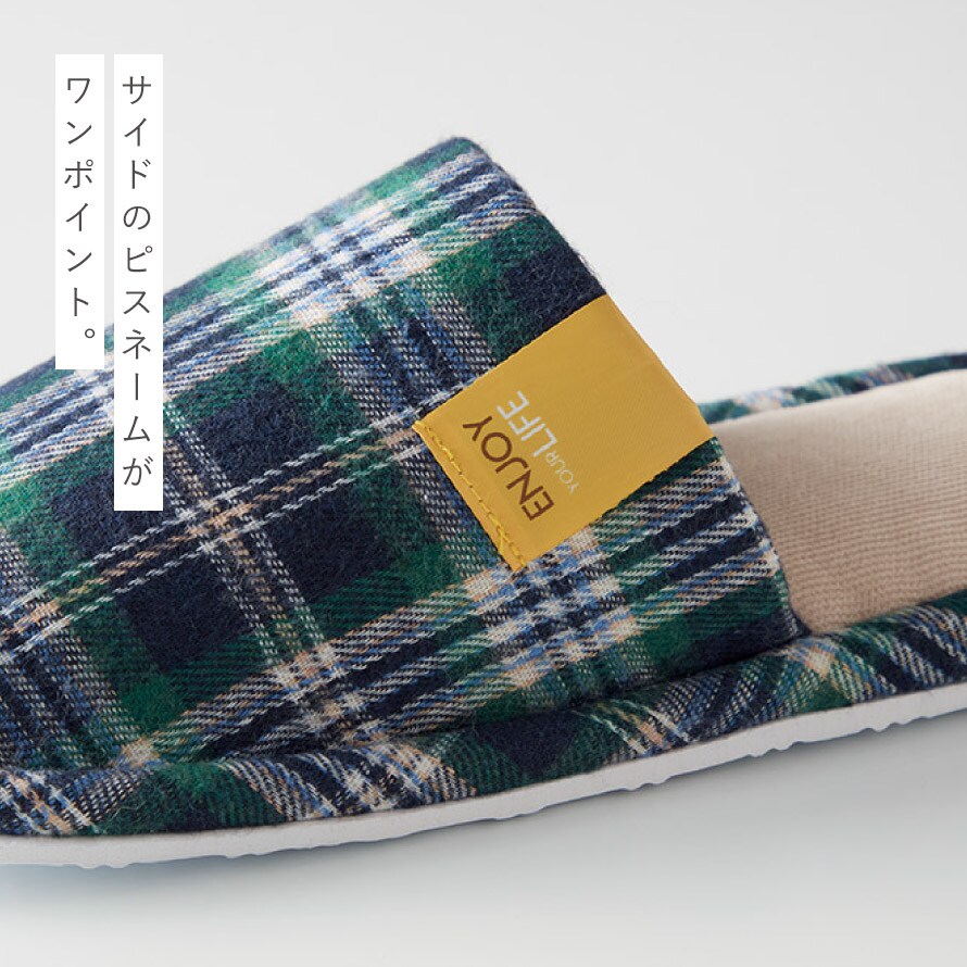 インテリアに馴染む、飽きのこないチェック柄。ベーシックなカラー&デザインでロングシーズン使えるスリッパ3色組。ピスネームがワンポイント。