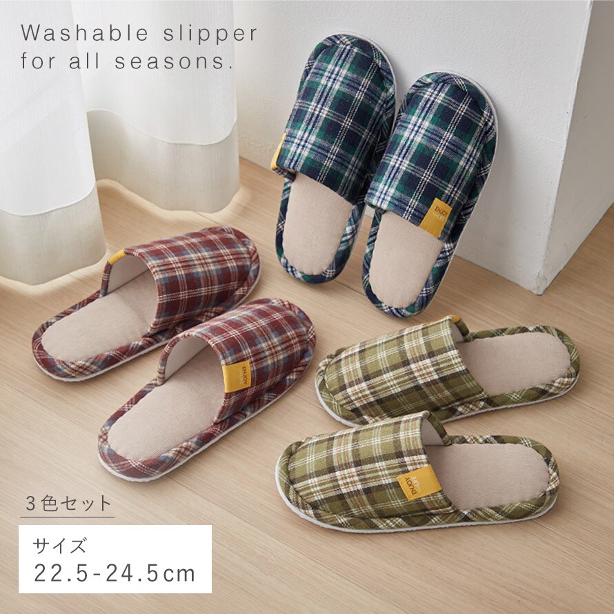 スリッパ チェック柄 3足セット おしゃれ 洗える 滑りにくい 室内履き ルームシューズ メンズ レディース 来客用 家族用 シンプル かわいい 洗えるチェック柄スリッパ カントリー3色組