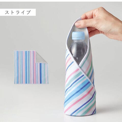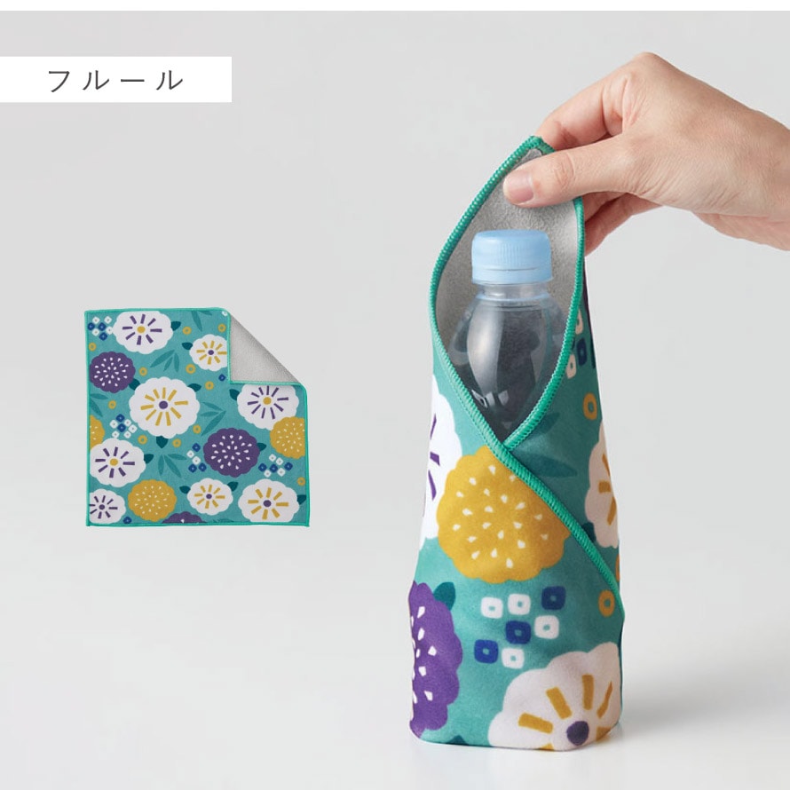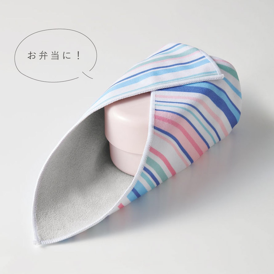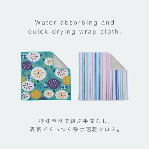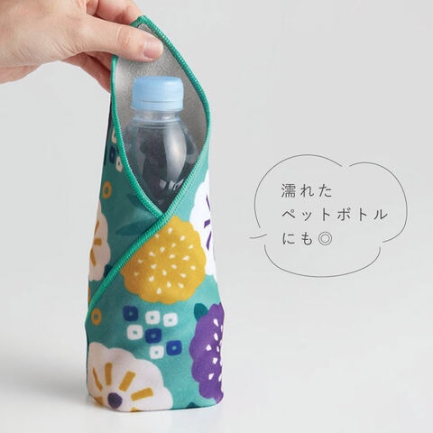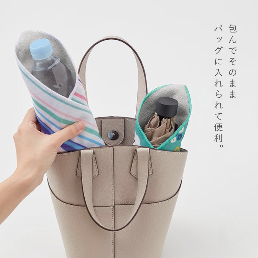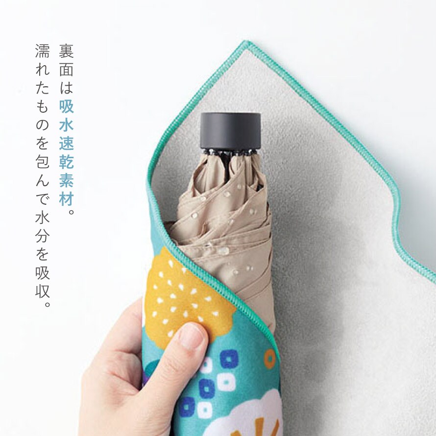 無地の面は吸水速乾機能があるので、濡れた折り畳み傘や、水滴のついているペットボトルを包んでそのままバッグに。アイデア次第で様々な使い方ができる便利なクロスです。