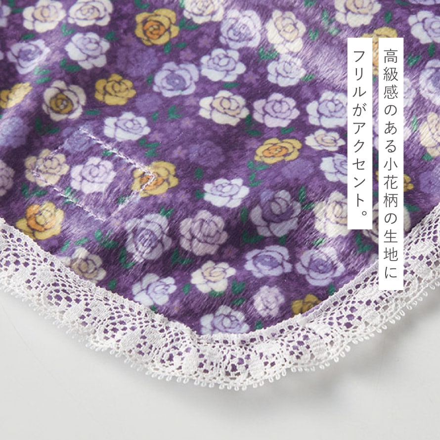 パープルと小花柄のデザインに、ベルベットのような高級感のある素材。白いレースのフリルが上品なアクセントになった上品なカバーです。