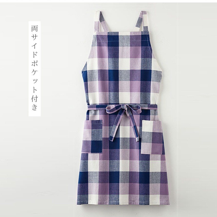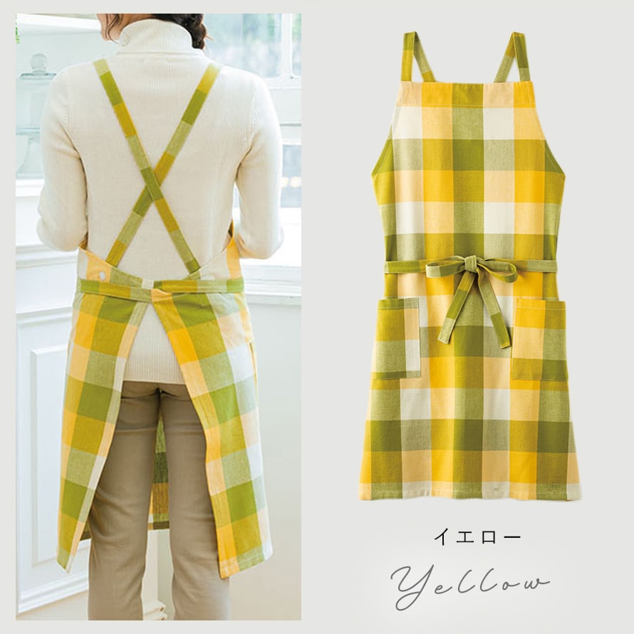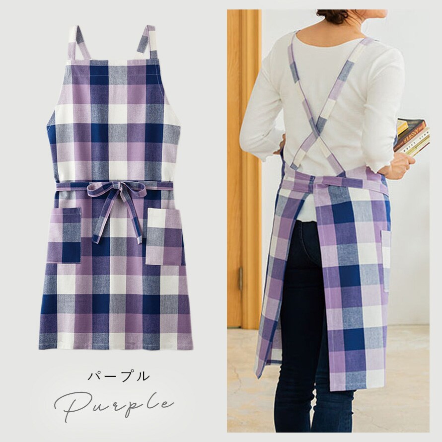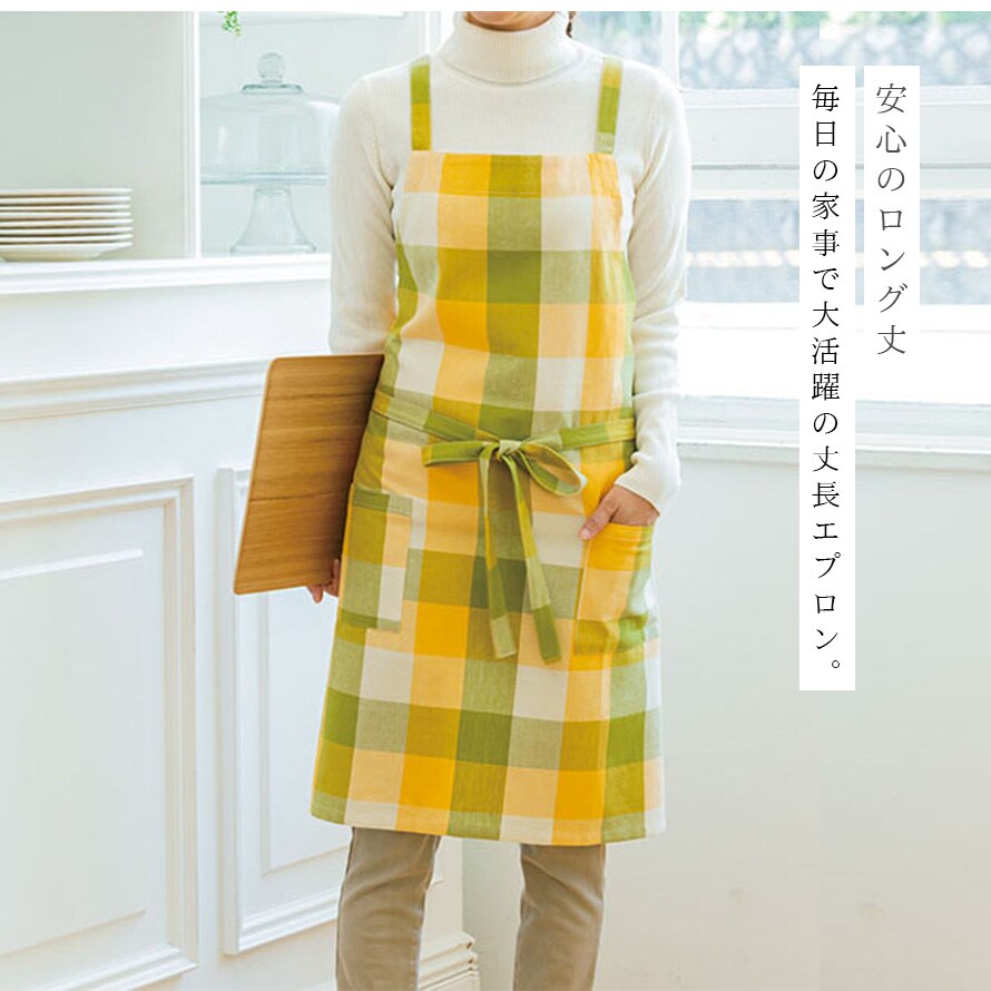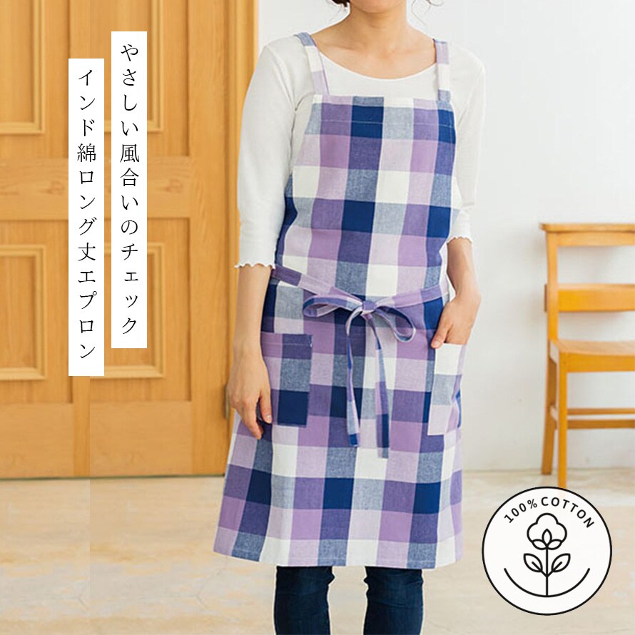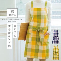綿100% エプロン ギフト レディース チェック イエロー パープル インド綿 ポケット付き ロング丈 シンプル ナチュラル おしゃれ かわいい ゆったり 動きやすい 家事 料理 キッチン 台所 フリーサイズ ロングエプロン 着脱簡単 カジュアル 母の日 ワークエプロン 保育士
