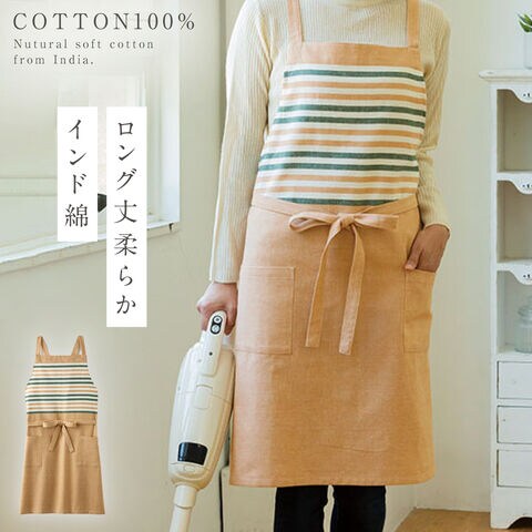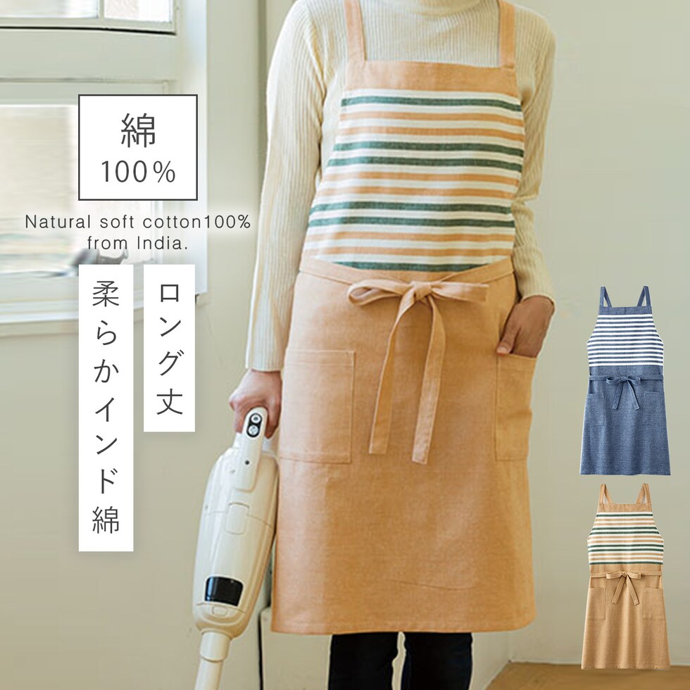 綿100% エプロンギフト レディース ボーダー デニム調 ベージュ系 インド綿 ポケット付き ロング丈 シンプル ナチュラル おしゃれ かわいい ゆったり 動きやすい 家事 料理 キッチン 台所 フリーサイズ ロングエプロン 着脱簡単 カジュアル ワークエプロン 保育士