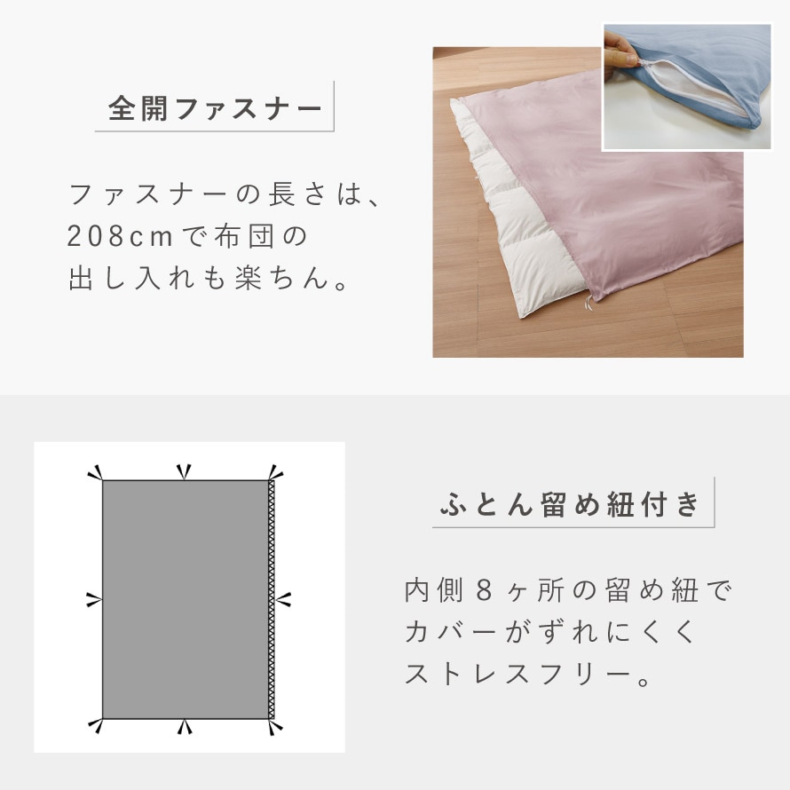 208cmのファスナーなので、布団の出し入れも楽ちんです。