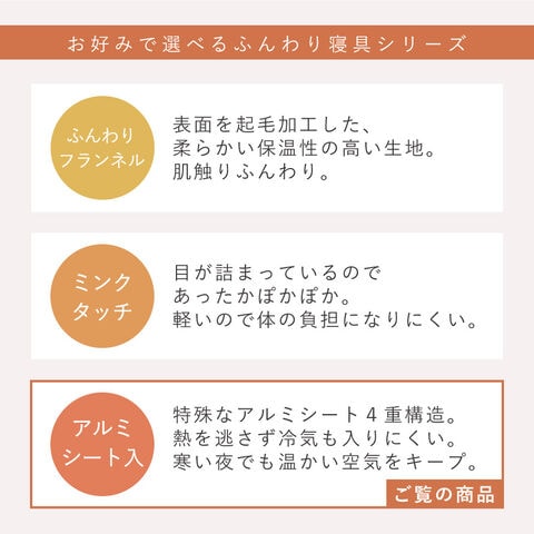 「フランネル生地」「アルミシート」「ポリエステルわた」「裏地」を重ねた特殊な4層構造で、熱を逃さず冷気も通さない設計。アルミとわたのダブル効果で、寒い夜もあたたかな空気をため込み、体に心地よい暖かさを提供してくれます。