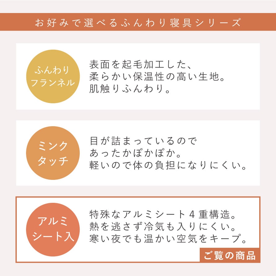 アルミシートが熱を逃さず、冷気も入りにくい。「アルミ」と「わた」のパワーで、寒い夜でも温かい空気をキープしてふんわりポカポカの寝心地に。アルミシートは特殊加工でゴワツキもありません。