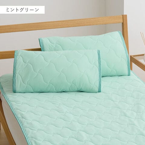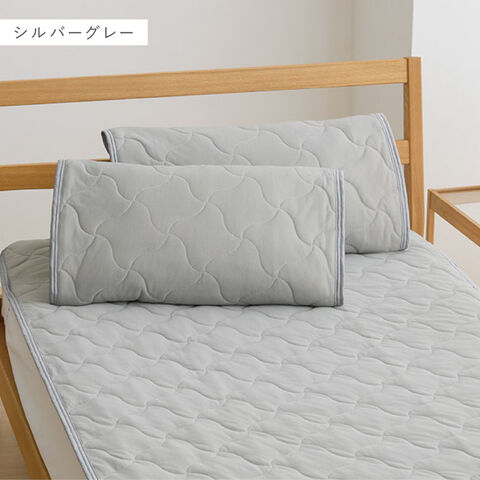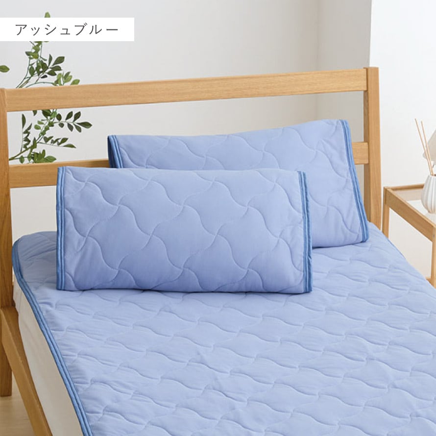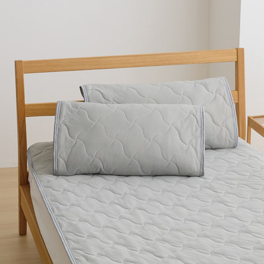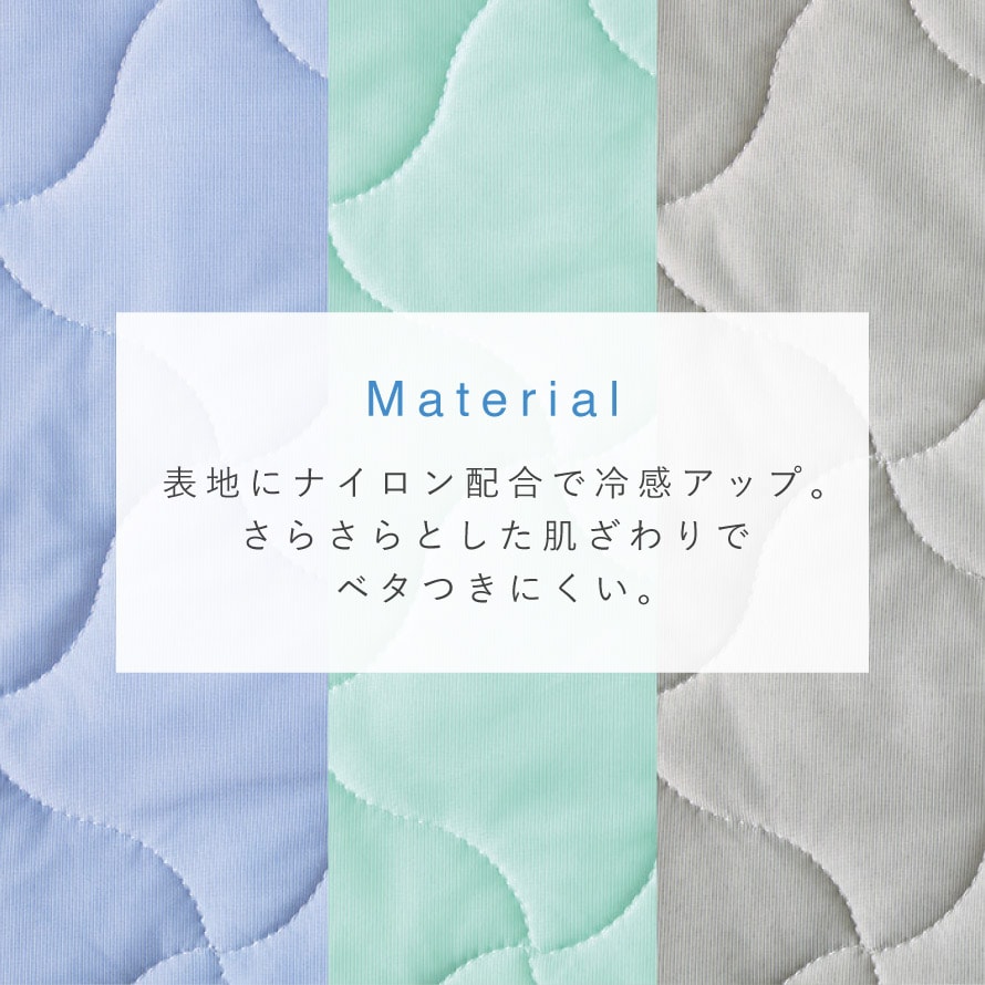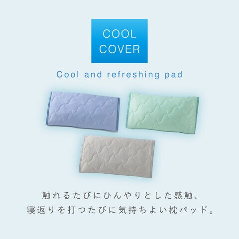 カラーはアッシュブルー、ミントグリーン、シルバーグレーの3色展開。寝室にやさしく馴染む、落ち着いたカラーをご用意しました。暑い季節を快適に乗り切る、さらひや触感のまくらパッドです。