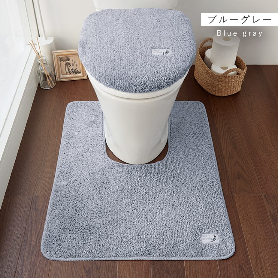 どんなトイレのインテリアにも合わせやすい無地のトイレマット&蓋カバー。右端のタグがワンポイント。